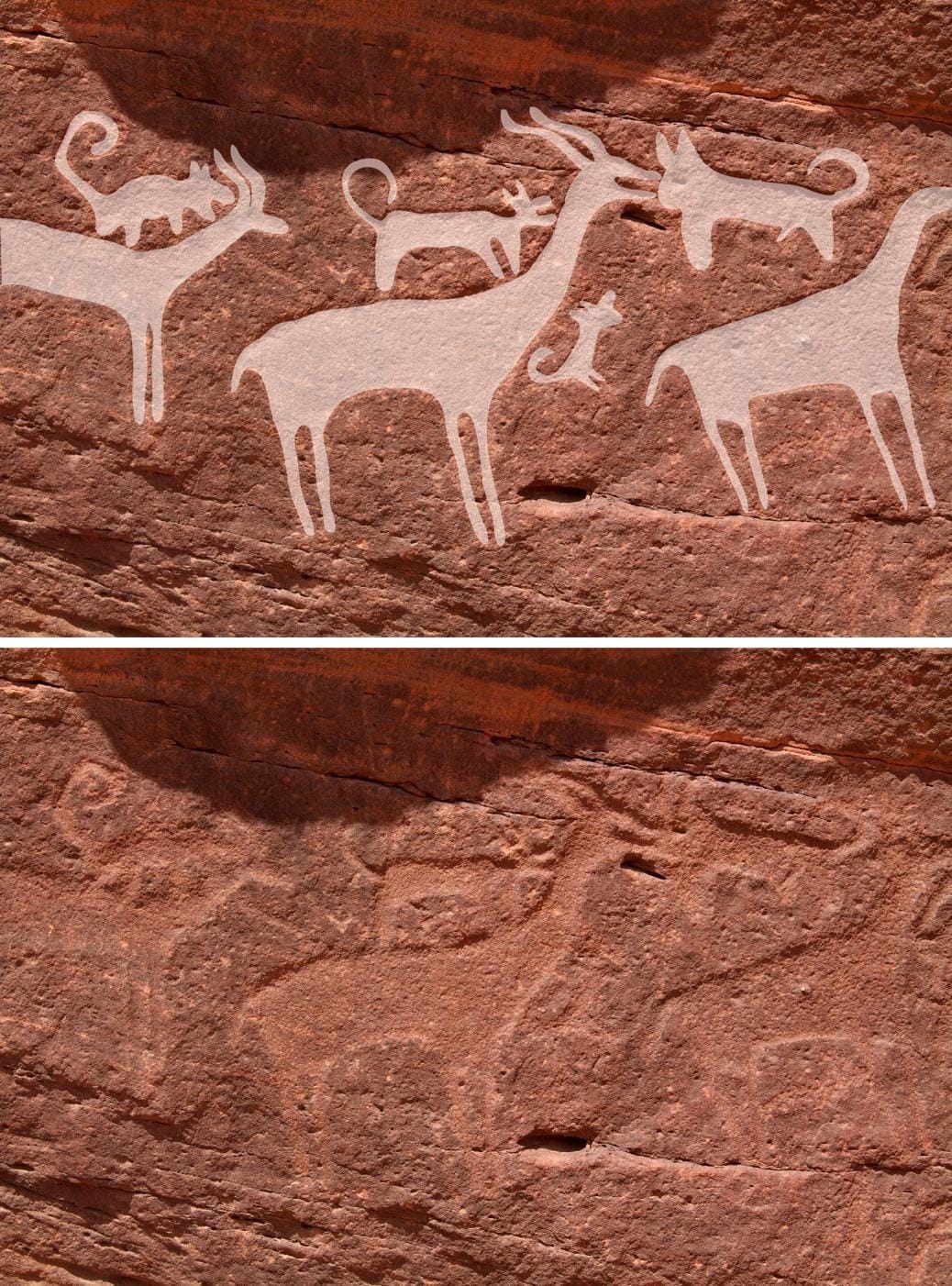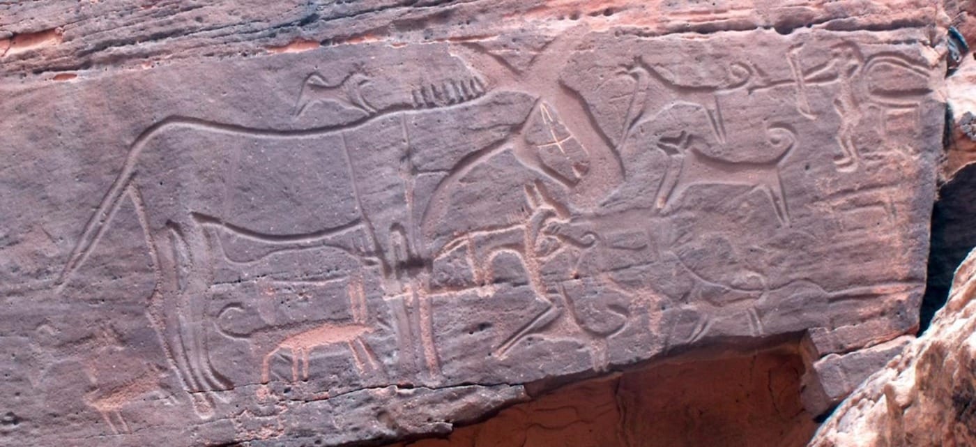 This meat came from a wide variety of sources, as the rock art reveals. The panels at Jubbah and Shuwaymis show canines chasing after cattle, oryxes, equids, aurochs, cattle, wild camel, and even a lion. Some scenes even depict the aftermath of a successful hunt, recording dogs that bite the necks and bellies of ibexes and gazelles.