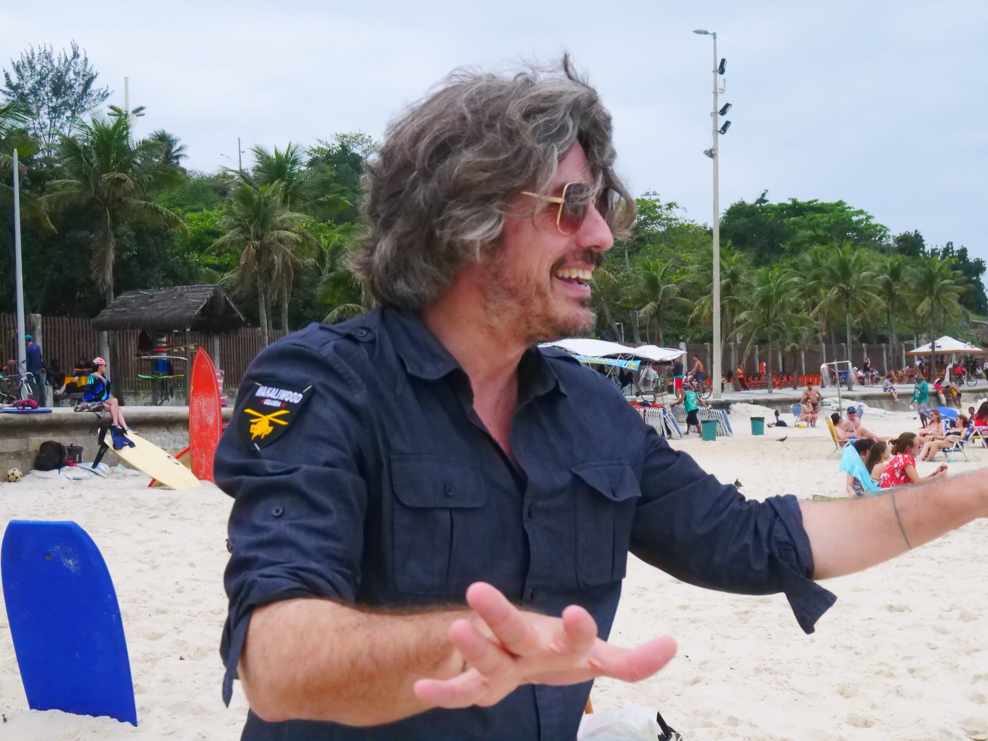 I went in search of Rocinha’s low-budget Hollywood scene after meeting American filmmaker Alan Hofmanis by chance at a traditional Rio de Janeiro fast-food style chicken restaurant in the bustling tourist neighborhood of Copacabana. I struck up a conversation with him about his dessert and ended up learning about Wakaliwood, Uganda’s version of Hollywood, named after Wakaliga, the slum in Uganda’s capital of Kampala where the films are made. Eight years ago, after Hofmanis saw a trailer for a feature by Ugandan director Isaac Nabwana that mixed mafia gangs, kung fu, and gun fighting, he hopped on a plane to meet Nabwana. In 2013, Hofmanis sold everything he owned in New York and moved to Wakaliga, where he has been making movies with Nabwana ever since. Nabwana founded Uganda’s first action-film company, has produced about 45 films, and just had his feature Crazy World premiere at this year’s Toronto International Film Festival (TIFF).