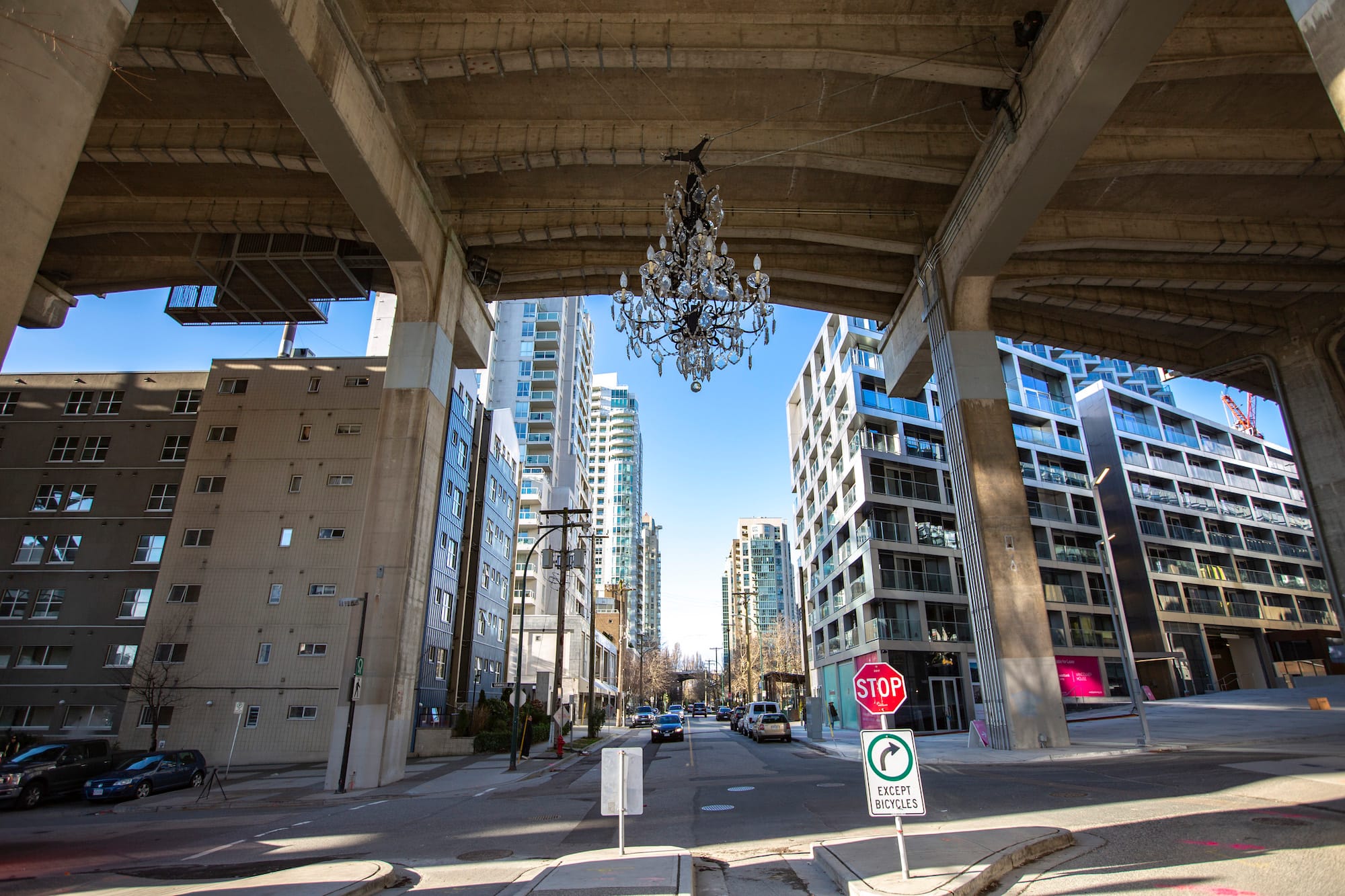 Vancouver locals might be most well-acquainted with his work "Spinning Chandelier" (2019), a public art piece that hangs under the city’s iconic Granville Bridge, which lights up and spins three times a day. Instead of appearing as a decadent fixture of a ballroom, the work is tucked in the gritty zone beneath a concrete underpass. The installation caused some controversy when construction difficulties increased its price tag to $4.8 million, a cost paid by a luxury developer.