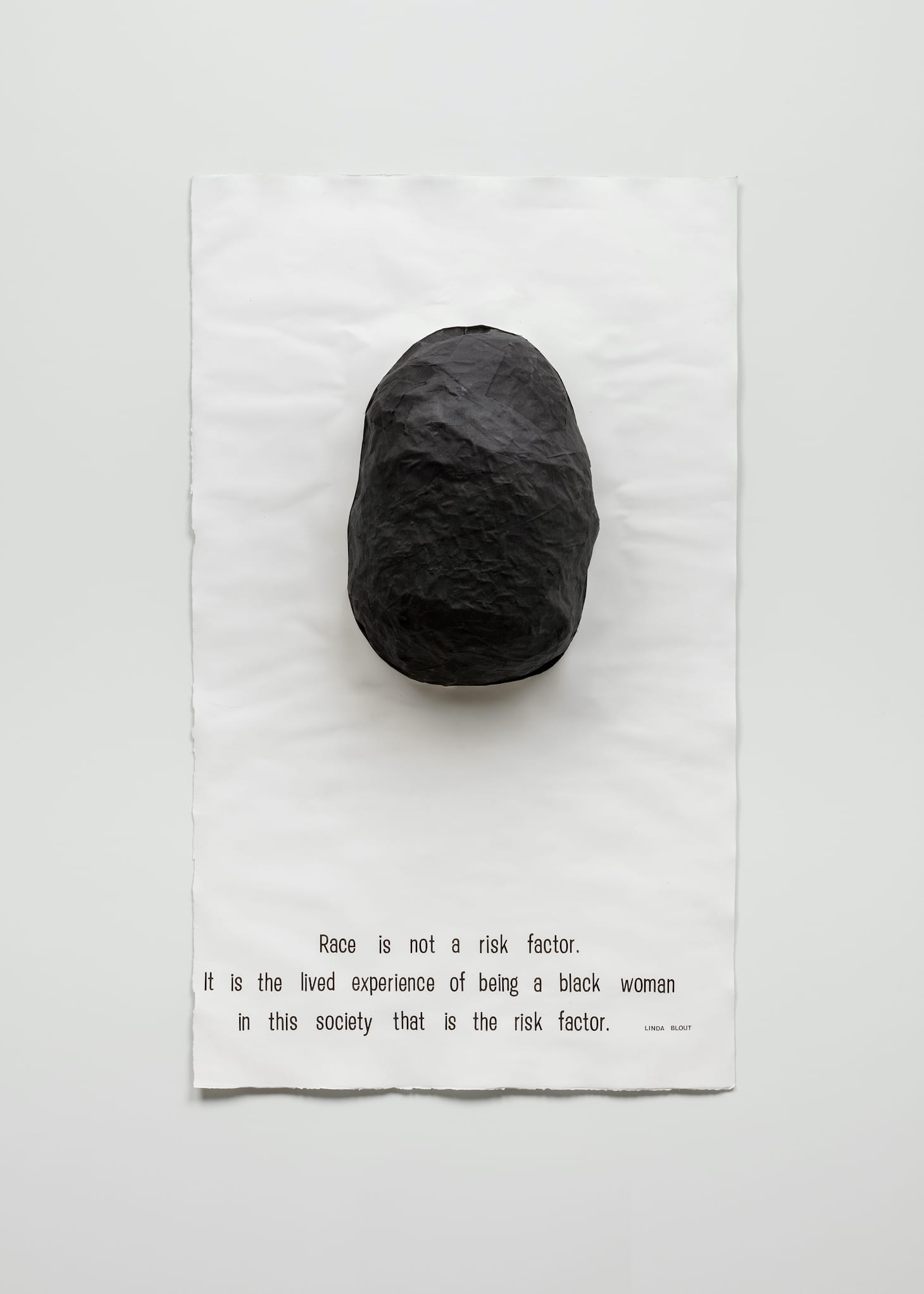 While the drawings layer the history of violence against Black people in the US with the unspoken biases of American modern art, a series of sculptures made of fabric and chicken wire and painted black expand on the politics of representation that haunt abstraction.