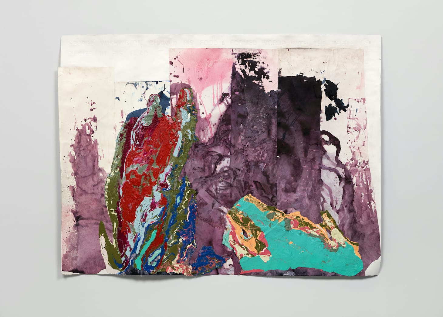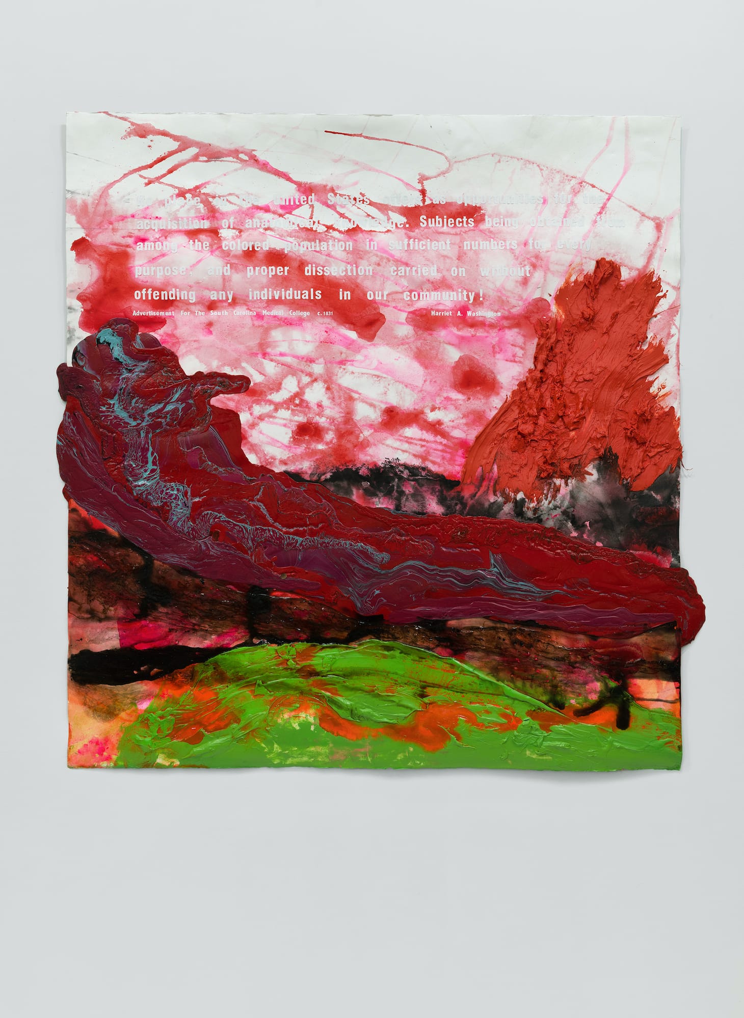 The effect evokes psychic and physical violence — in “Anatomical Acquisitions” (2020) a maelstrom of red paint is juxtaposed with an unsettling 1831 advertisement by South Carolina Medical College that promotes the program’s acquisition of cadavers from the Black population for dissection. Likewise, the washes of multicolored pigment, splattered across vertical strips of white paper, that compose “Inside the 1st President’s Mouth” (2020) allude to both physical and emotional turmoil summoned in the nearly invisible white text: “George Washington chewed his food and formed words with the teeth of slaves in his head.”