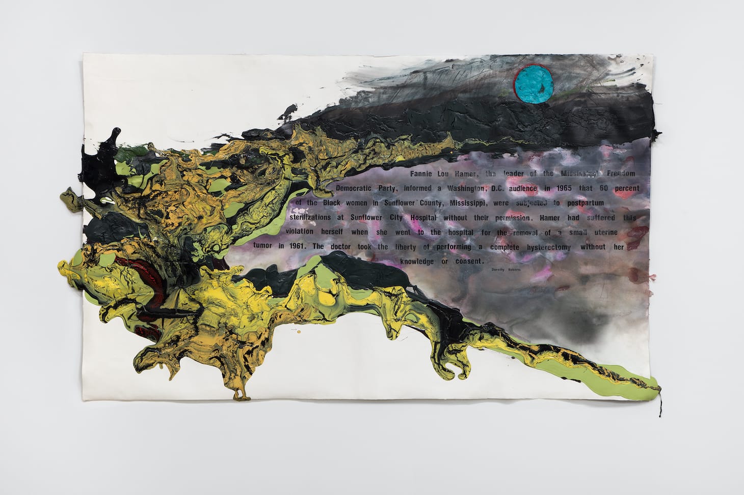 In the drawing “Mississippi Appendectomy” (2020), for example, a statement by civil rights scholar Dorothy Roberts on medical procedures performed on Black women without their knowledge in the 1960s emerges from a smoggy pink-gray murk, framed by a swirl of oily black and toxic green pigment that seeps off the page. A turquoise circle near the top suggests an eerie moon or all-seeing eye, and conjures a polluted landscape.