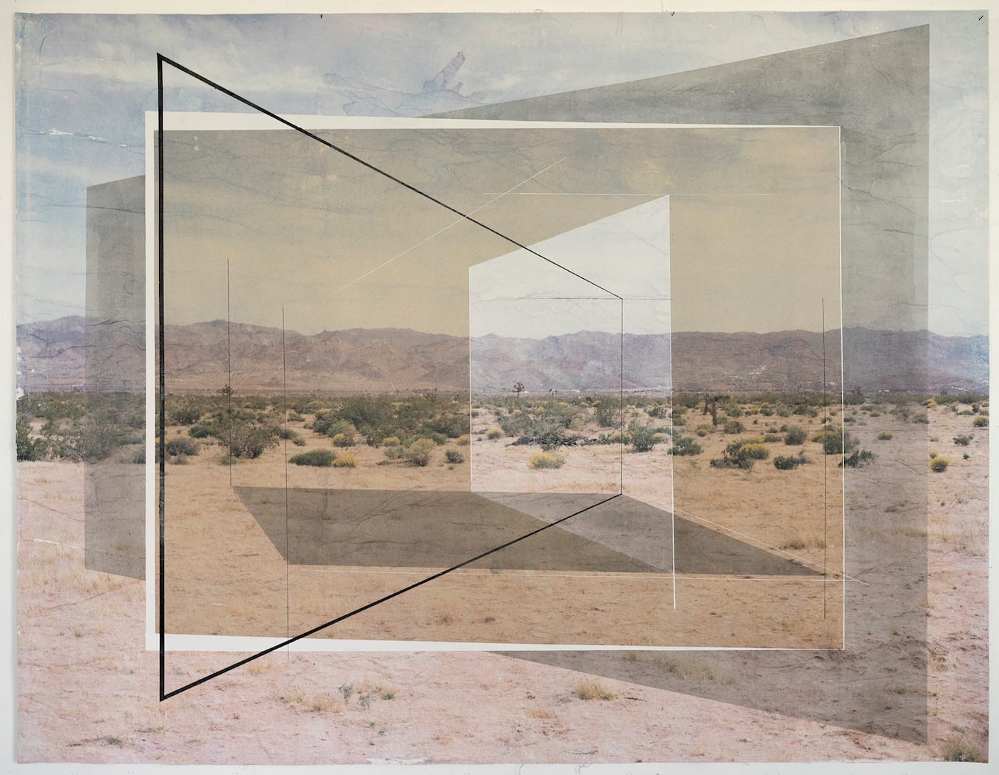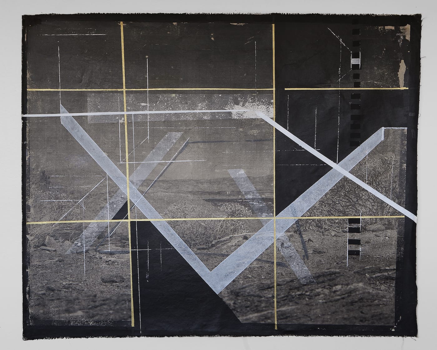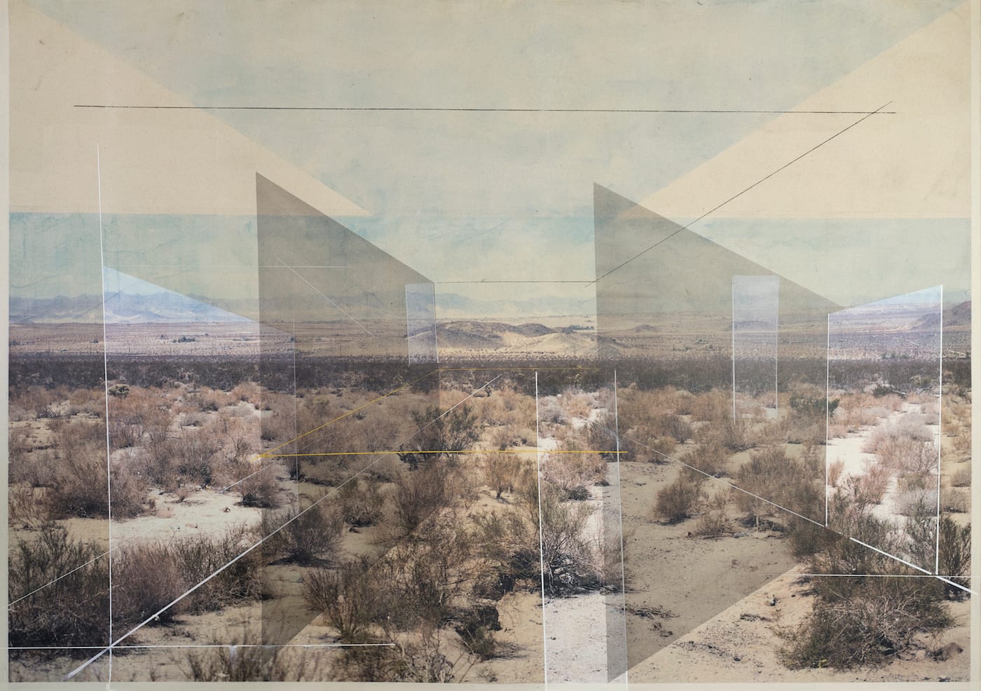 Abstract lines and shapes break up Rodrigo Valenzuela's barren mixed-media landscapes of Joshua Tree National Park and Chile’s Atacama desert.