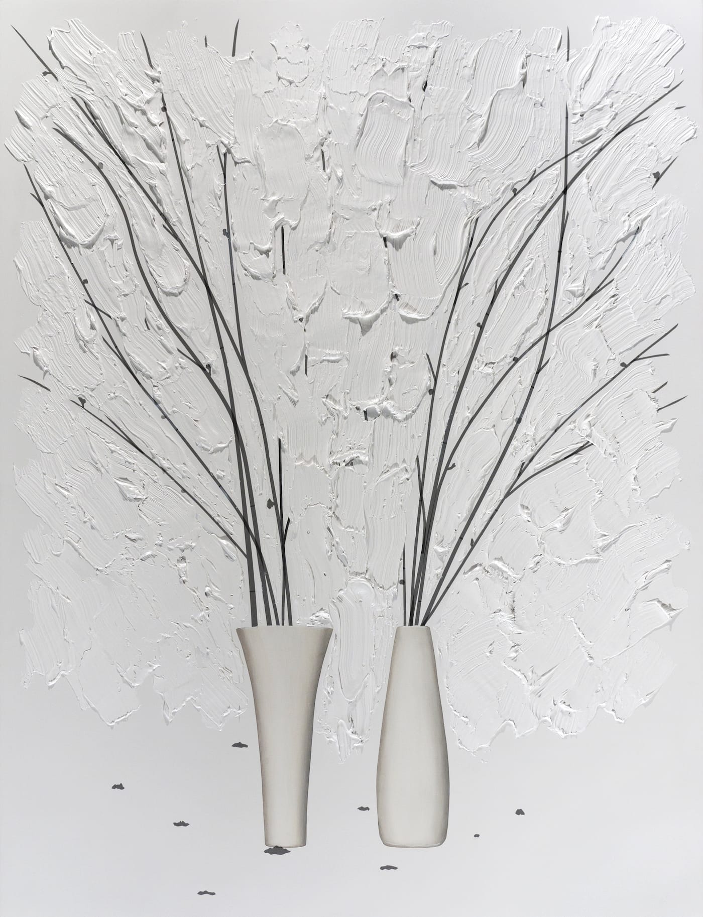 Reiss examines painting as a sculptural object; similarly, he examines sculpture from a painterly impulse, as an exploration of color. He is known for playing with scale, using cinematic framing and fracturing his narratives. The viewer peers into the miniaturize worlds of his dioramas like a giant voyeur, but looks directly at human-scale, in-your-face stylized flowers in his recent paintings, which critic James Scarborough writes are “not still lives but Vanitas painting for a digital age.”