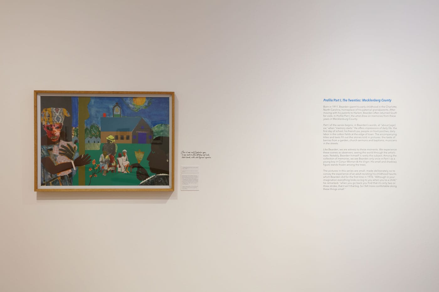 Bearden’s work represents two distinct views of African American experiences in the early 20th century: depictions of the rural South and the urban North, including the Harlem Renaissance. Bearden’s family moved to Harlem from North Carolina when he was a toddler, and he finished high school in Pittsburgh, but Bearden frequently visited his family in the South throughout his adolescence. As an adult, he returned to New York City. He is at his peak creatively in the Profile series; he coalesces these parts of his past — digging deep into his memory and using a wide array of materials and techniques to capture these moments and collapse these contrasting experiences into singular images.
