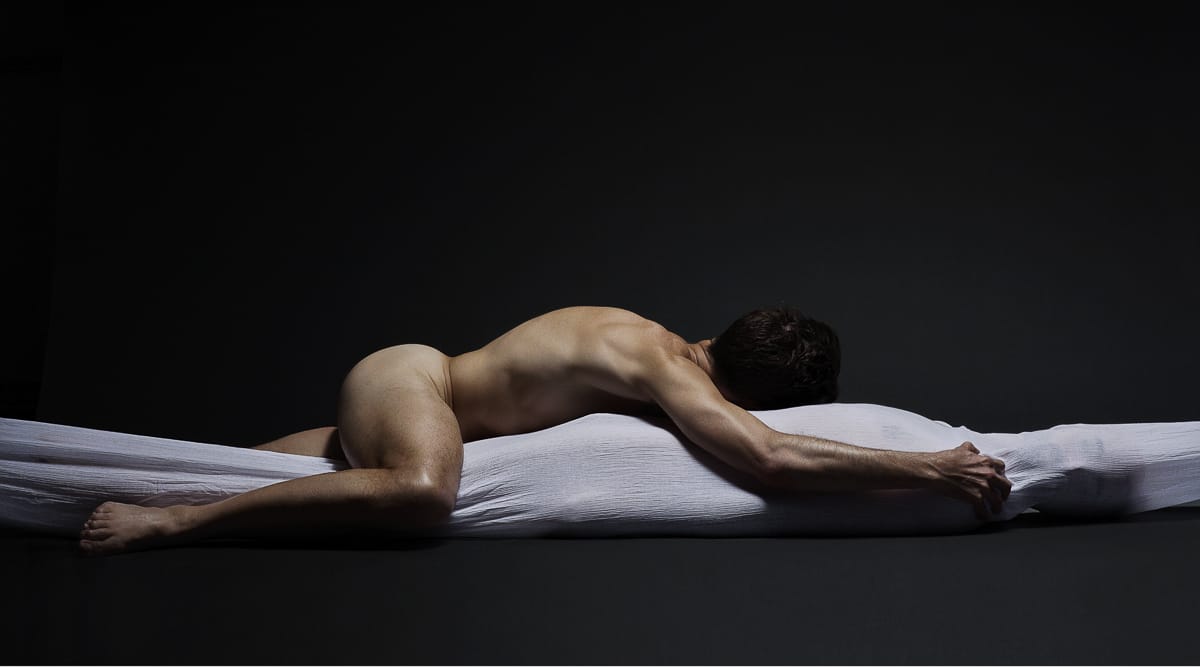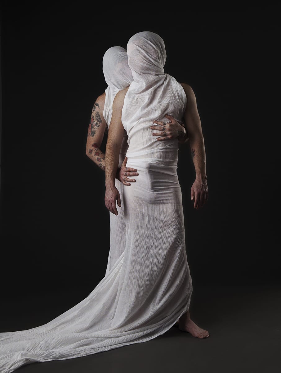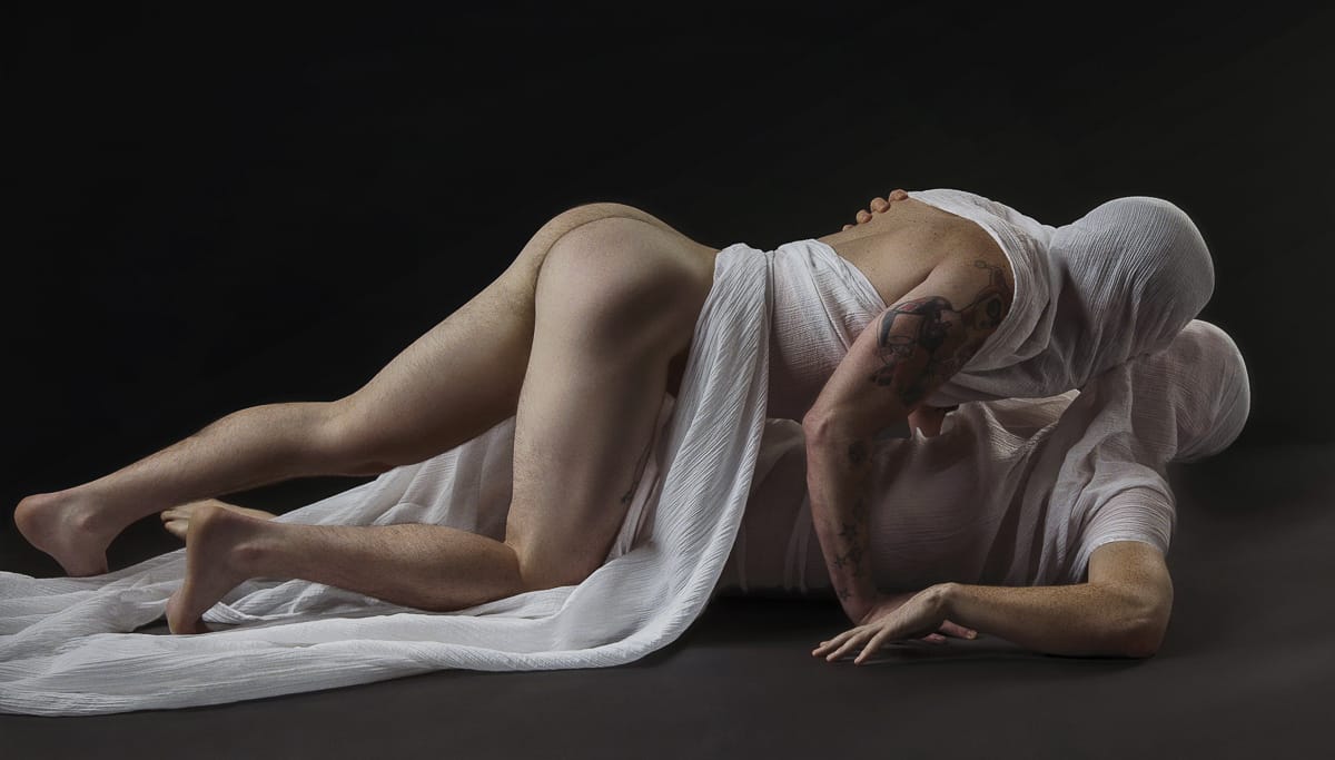 What the viewer encounters at this show is far more enigmatic and psychological, which befits a museum for Gay and Lesbian Art but requires a primer. Photographs of nude men who are veiled with white fabric might not seem obviously connected at first to Trump’s political assault on gay rights. But Amato’s invitation is to ponder hiding and visibility in visual terms. The male nudes are covered so extensively in opaque white fabric that they appear to be hiding from the viewer, sometimes from each other, perhaps even from themselves. Let’s not kid ourselves — the Trump administration is trying to send gay men back into hiding.