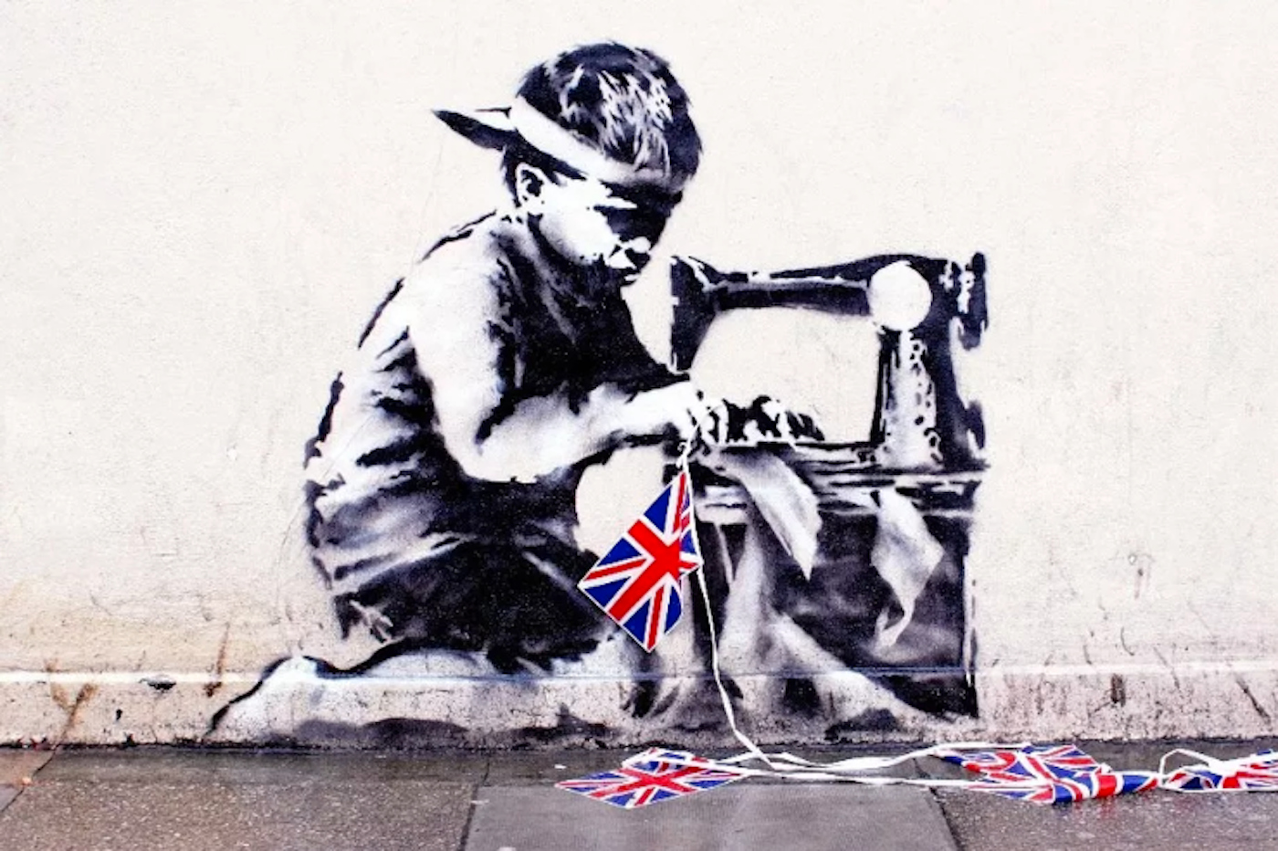 English’s target is Banksy’s “Slave Labour (Bunting Boy)” (2012), which he recently acquired for $730,000 at Juliens Auctions in Los Angeles. The work depicts a young child crouched over a sewing machine as he produces Union Jack bunting. It was a protest against the controversial use of sweatshops to manufacture memorabilia for the Diamond Jubilee and London Olympics in 2012. And while “Slave Labour” was first painted on the outside wall of a bargain shop in north London, it was mysteriously removed months later before resurfacing at an auction in Miami in February 2013. It was subsequently removed from auction after considerable appeals by residents of its hometown London suburb, Wood Green. Regardless, the mural was eventually sold at auction in the UK, fetching a price of $1.2 million at Bankrobber London.