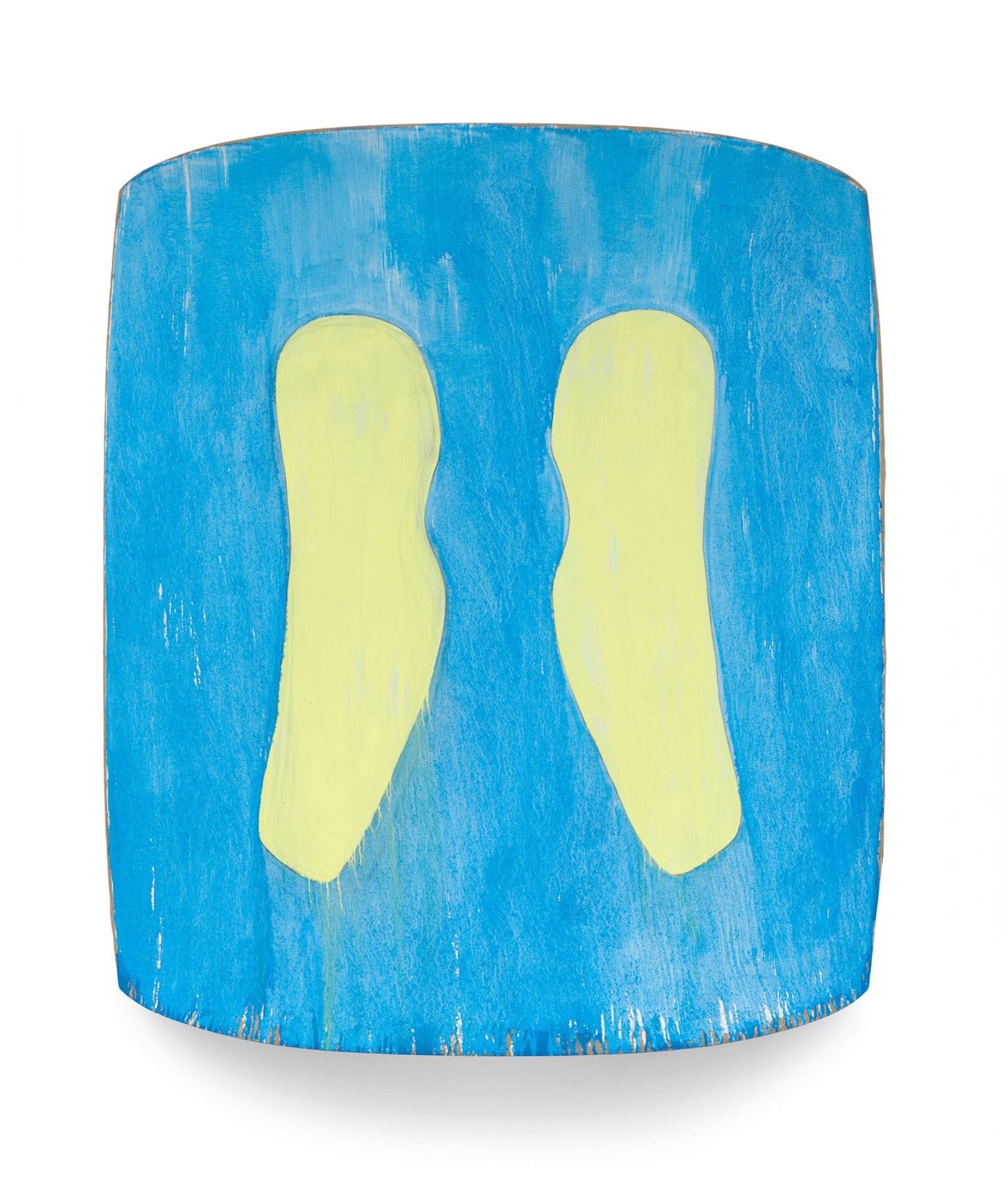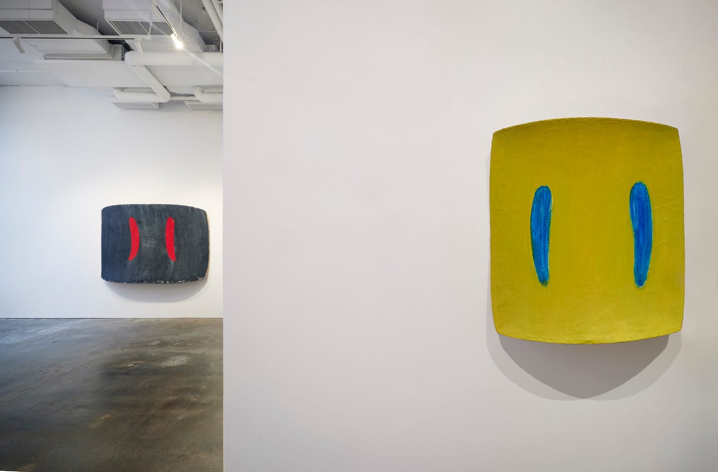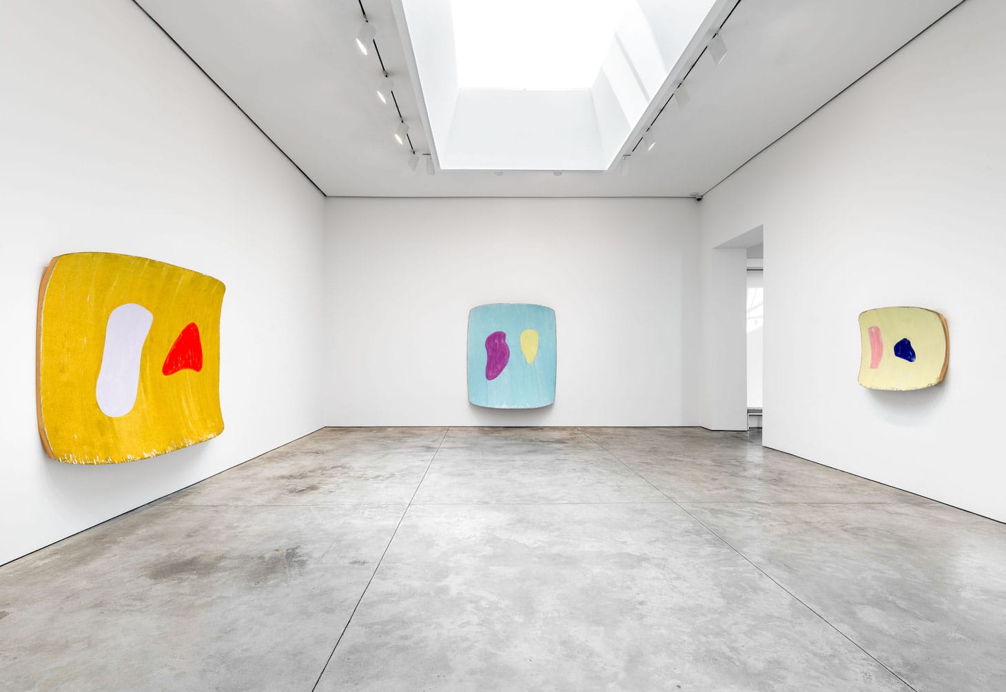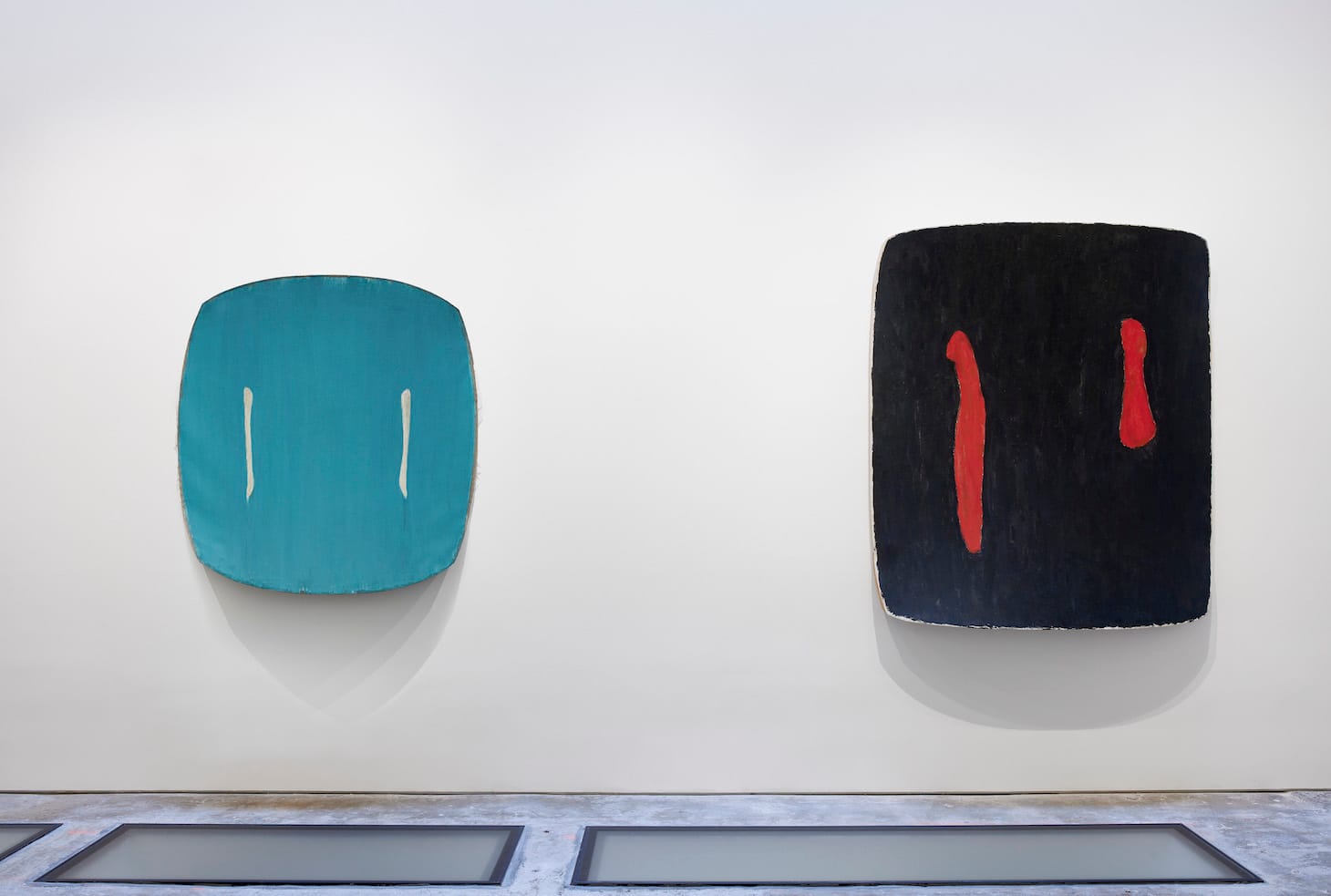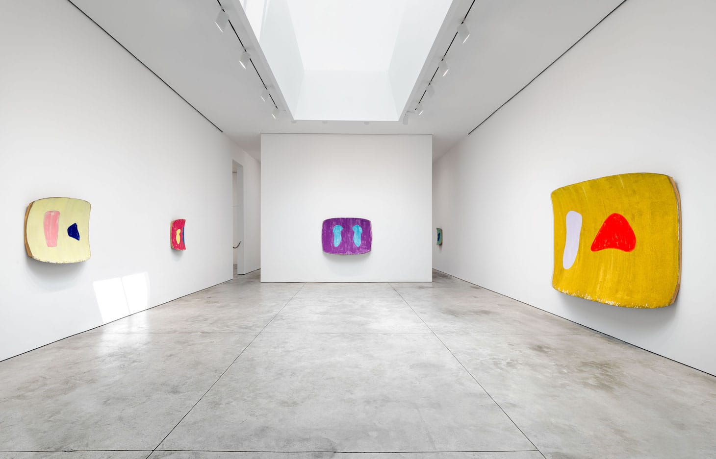 Ron Gorchov: The Last Paintings at Cheim & Read presents works made between 2017 and 2020, when he died at the age of 90. Using his saddle-shaped frame, the canvas is mounted on a wooden stretcher with a gentle concave curve in one direction and a convex surface at 90 degrees to the concave side. To either side, left or right on this background field, Gorchov sets rounded inserts. In these works, all of the forms are gently rounded. The varied colors of the inserts play against those of the background, which can be as pale as that of “Sir James Jeans”(2020), with its lilac background, or as intense as the deep blue of “H” (2020). In “Close Call” (2020), turquoise paint drips down the right insert, revealing traces of the bare linen surface at the top and bottom.