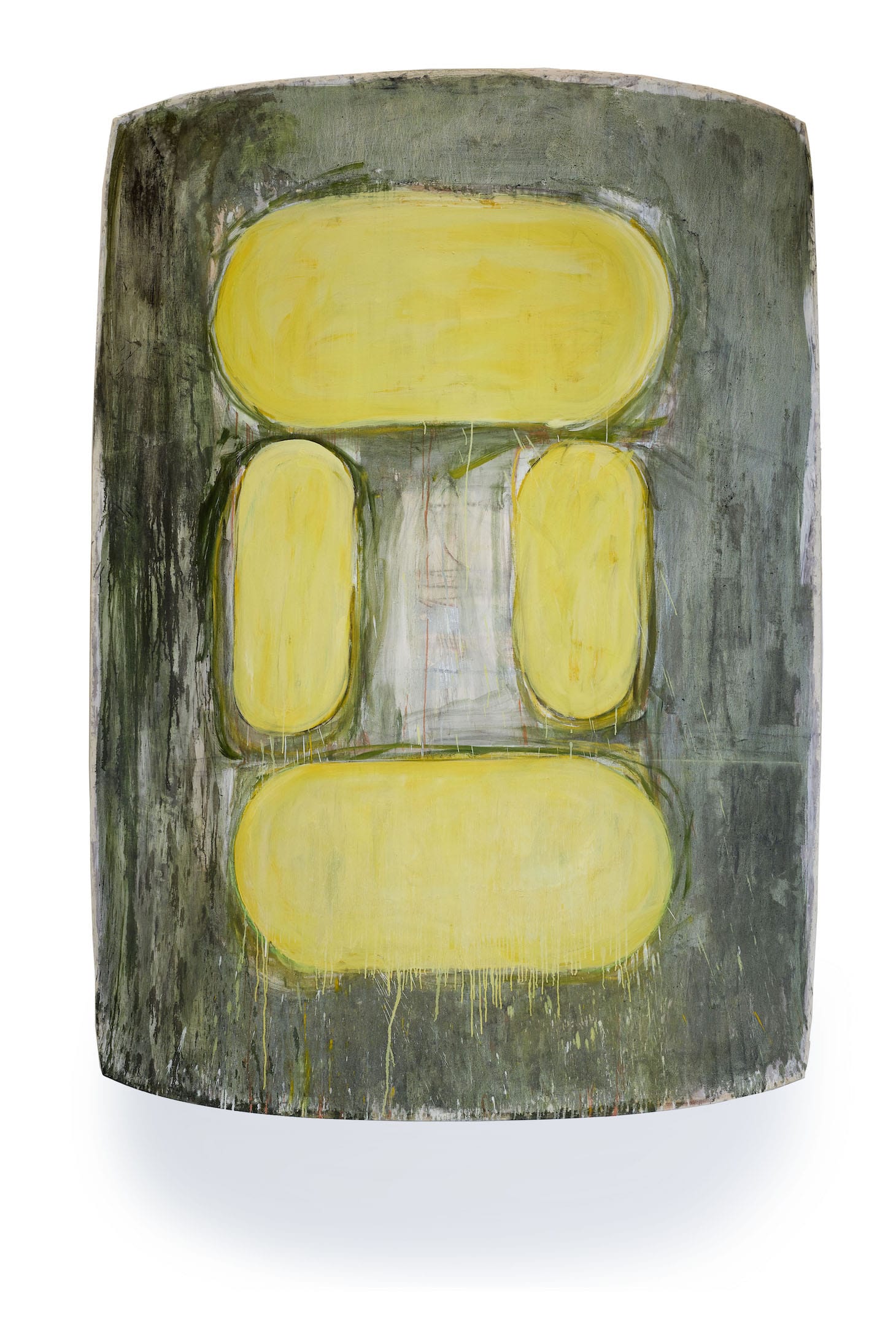 Without using any explicit imagery, and without any recognizable allusions to art’s history, Ron Gorchov’s abstractions merge intense color and brilliantly original compositions. He is a major New York artist who only late in life became celebrated. And two concurrent Chelsea shows offer marvelously complimentary pictures of his development. Ron Gorchov: Spice of Life at Vito Schnabel Gallery conveys, on two floors, the story of Gorchov’s identification of his mature style. “Set” (1971), which is 14 feet tall, is a stack of four sprawling, shaped monochrome canvases. It is an oddly gawky work that resembles a classic Ellsworth Kelly gone bad. “Untitled” (1976–77) is an early version of Gorchov’s more recent format, its graceful shapes, much slimmer than those usual in the newer paintings, set on a curved canvas. And “6th One” (2006) features four yellow rectangles with rounded edges, two of which are vertical keyhole shapes that insert color into the ground, as in Gorchov’s later works, and two are horizontal (and, at least in retrospect, appear redundant). His paintings work best, he discovered, when the two color inserts are roughly the same size, as in “Spice of Life” (1976), a good example of his later signature style. The show demonstrates how, by stages, in some cases making works that are less than fully successful, Gorchov moved toward his late, glorious resolution.