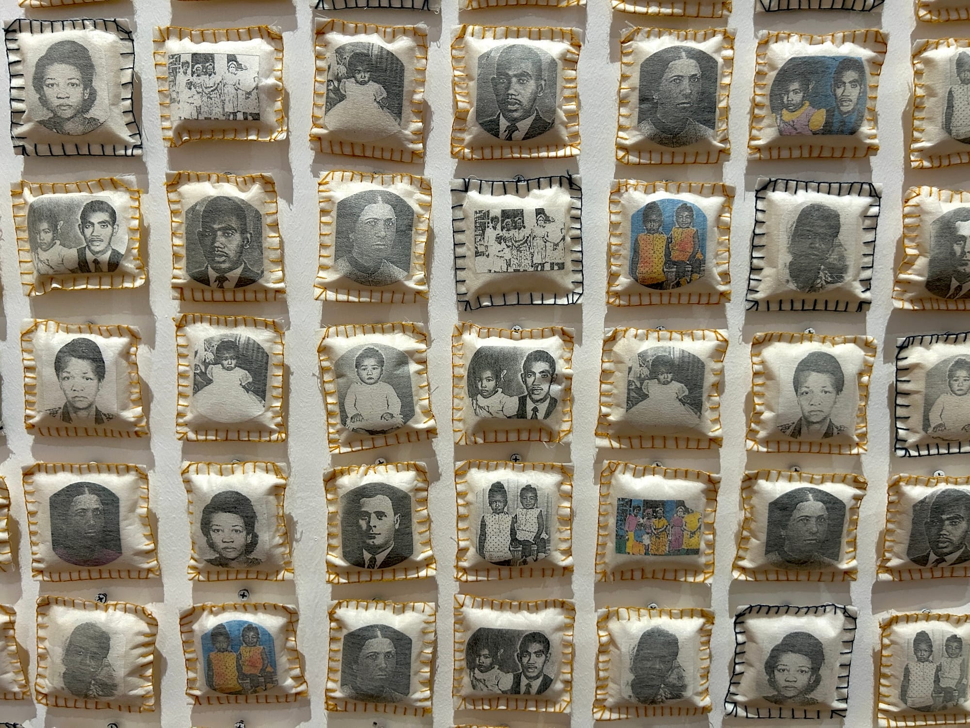 The art of sewing allows Paulino to play with the relationship between a whole and its parts, thus visualizing the tension between generic, textbook acknowledgments of slavery's legacy and a more complex reckoning with its individual ramifications. This is the mechanism at work in "Parede da memória" (1994–2015), a wall of more than 1,000 small, cushion-like sacks on which Paulino has transferred photos of her relatives and ancestors. Described as a patuás or amulets, the pillows are filled with spices and herbs considered sacred in Candomblé, an Afro-Brazilian syncretic religion that melds elements of West African, Islamic, and Catholic beliefs. The sprawling mural is immediately captivating when viewed from afar, but each minute representation of a man, woman, or child, and the visible blue and yellow stitching that frames it, can only be appreciated upon close inspection.