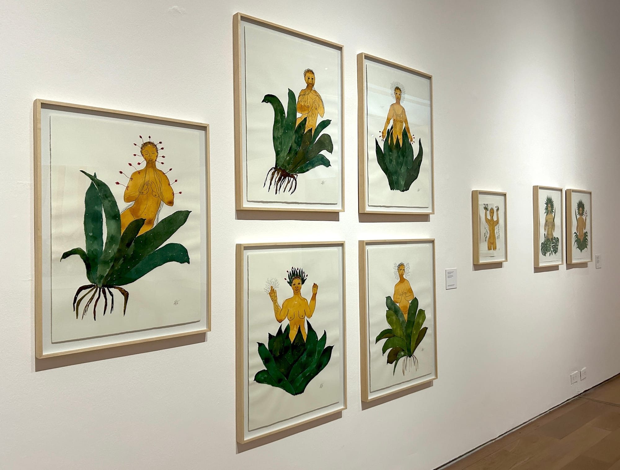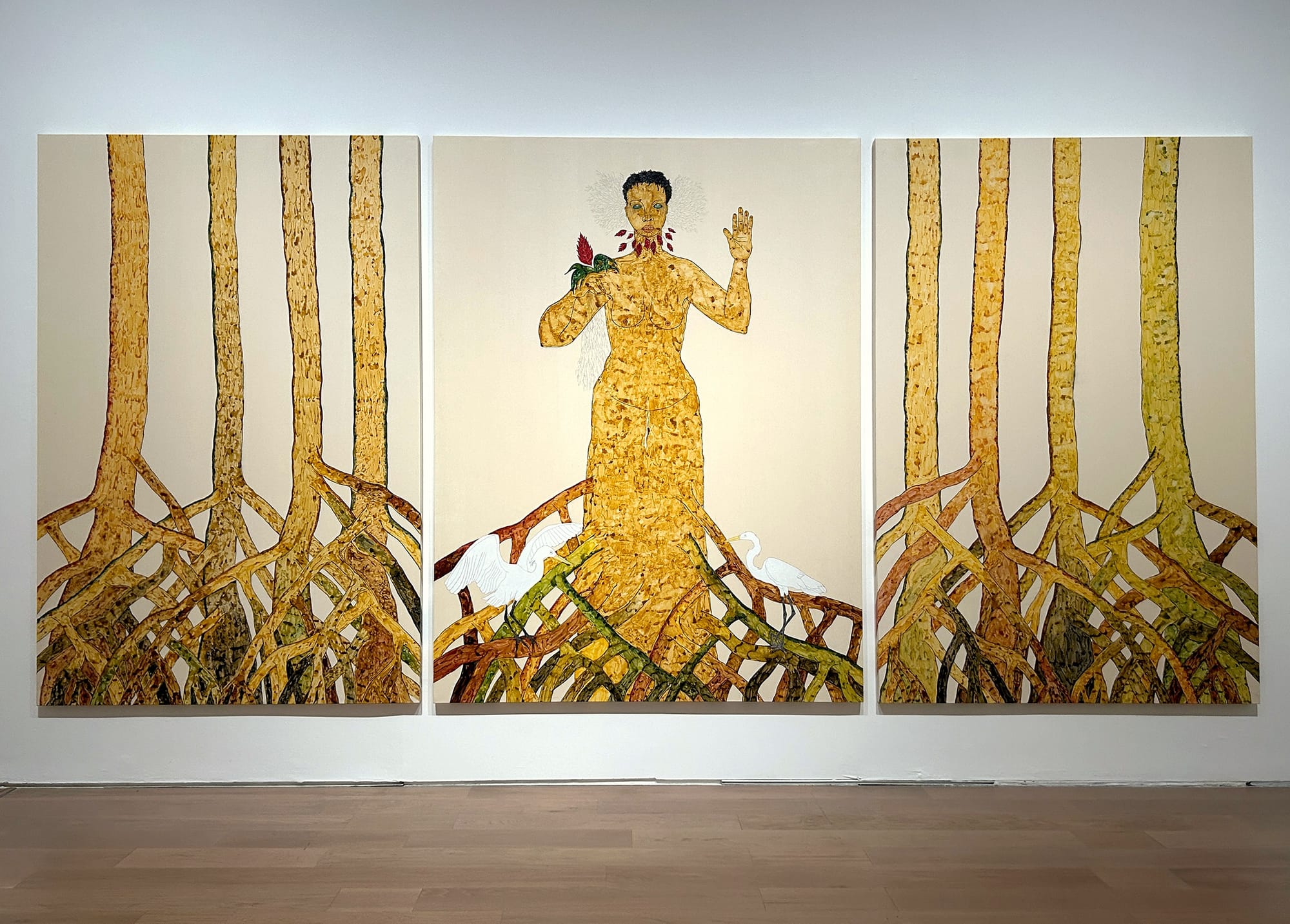 At the midpoint of the exhibition, the painting "Garça Branca" (2023), an outsized triptych rendered in hues of flaxen yellow and maize, stops us in our track. A central female figure emerges from a tangle of roots like a human mangrove. At once burgeoning out of and implanting herself further into the earth, her body's upward thrust echoes the tree trunks that flank her on either side. Bromeliads bloom from her lips and two herons, alabaster white against the cream ground, are perched at her feet. The interlocking, serpentine branches conjure the crosshatch pattern of Paulino's suturas, and the painting's protagonist seems to be born out of spools of golden thread. She resurfaces in nearby watercolor studies, such as the Jatobá (2019) and Nascituras (2023) series, sensual explorations of birth and awakening. The motif of a rhizome is also visible in "Assentamento," where the feet of the woman photographed from behind are replaced with Paulino's delicately radiating green and red embroidery, mooring the subject of an image whose very creation implied an uprooting.