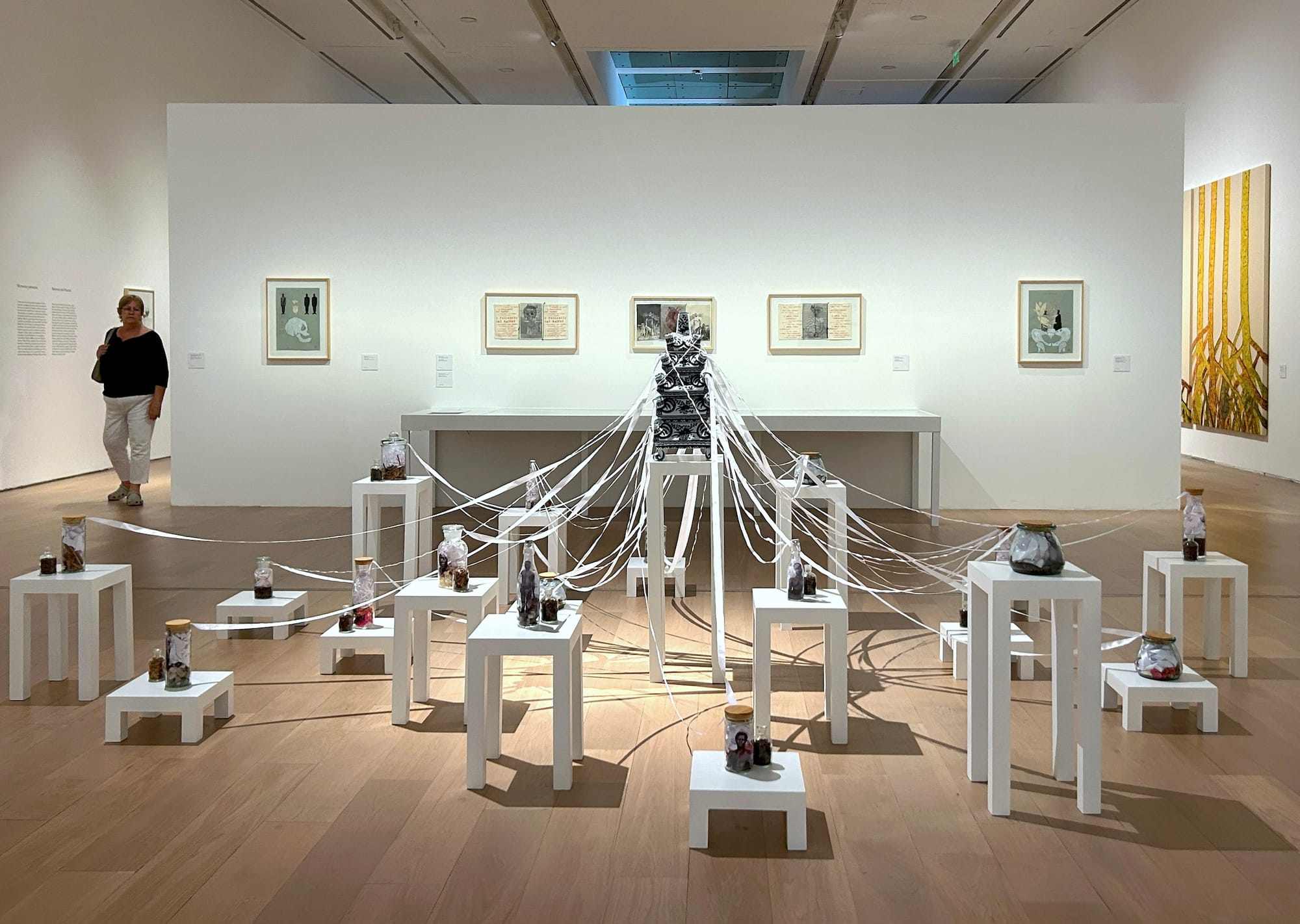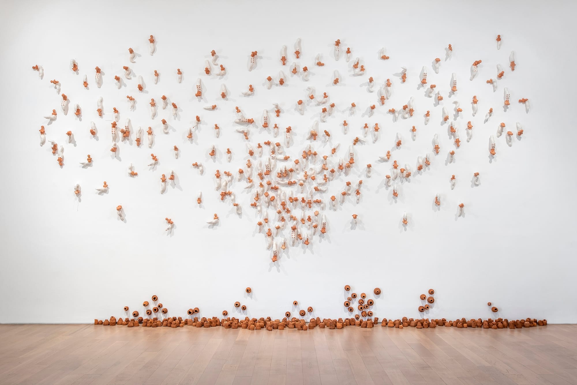 The coda of Rosana Paulino: Amefricana is the artist's massive wall-mounted installation "Tecelãs" (2003) ("weavers" in Portuguese), composed of hundreds of terracotta and faience figures wrapped in cotton thread, as though swaddled or cocooned. The silkworm-women stretch across the space in the manner of a swarm, but at eye level, each figure's shapely features are discernible. Paulino is intimately acquainted with clay — she traces her relationship with the material back to the days of sculpting mud figurines with her mother and sisters in her backyard. Here, the substance gives shape to her vision of Brazil, one in which Black women are protected and cared for. Yet, as in all of the artist's work, there is always another reading: The bodies, emerging but still constrained, are bound by cotton. In an interview quoted in the exhibition catalogue, Paulino rebuffs a feminist interpretation of her work on the basis that a central tenet of the movement, at least as posited by its leading White exponents, has been the right to labor. This was "never a question for Black women," she explained. "We have always worked, it is either that or dying of hunger."