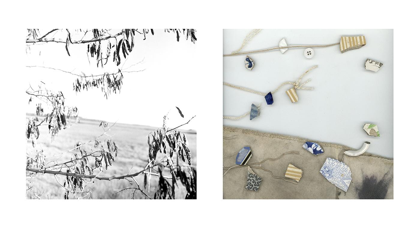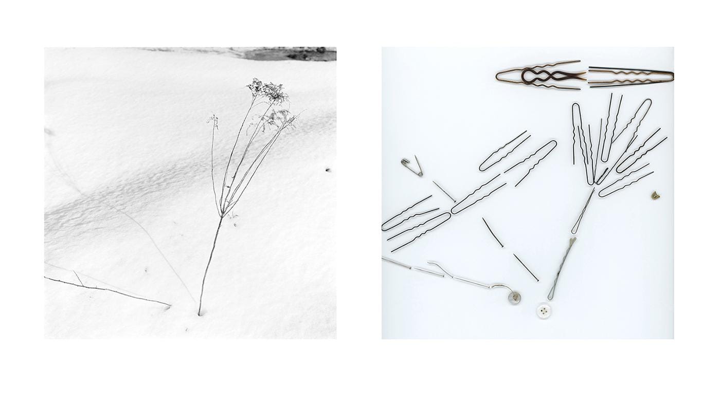 In another body of work, The Mimics, which will be featured in her book, Keeping House, Marasco took photographs of the Maine landscape with her Rolleiflex, something that she had not done since the 1980s. She was inspired to do this by a trip to Japan, where she photographed the landscape. She juxtaposed the Maine landscapes with another photograph. The second photograph, in which she made a “drawing” using things she found in her house, echoes the linear elements and contours of the first photograph. The “drawing” becomes an abstract ideogram of the landscape. The works bring together photo (particles of light) and graph (lines of writing). The juxtaposition opens a speculative space, where history, anonymity, language, preservation, loss, and the passage of time are collapsed into a symbol to be deciphered and contemplated — with traces of tenderness, pain, and beauty to be found everywhere we look.