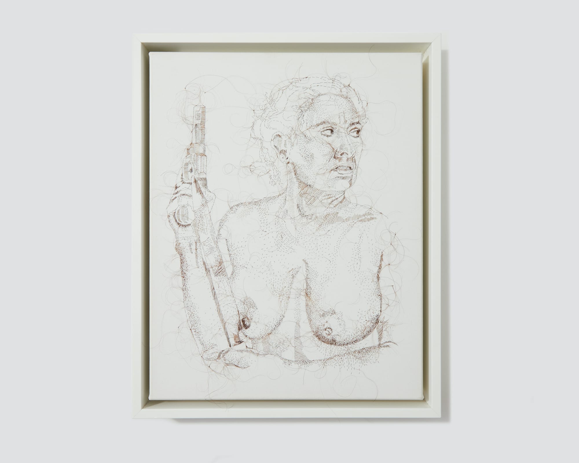 Although Meza-DesPlas replicates classic drawing techniques such as hatching, stippling, and shading by hand-stitching hair on paper or fabric, hair is hair, not thread, ink, or graphite. Drawing on and with this unique material in the 30-plus works on view, she addresses cultural stereotypes and sociopolitical issues including feminism, personal agency, ethnicity, violence, and aging.