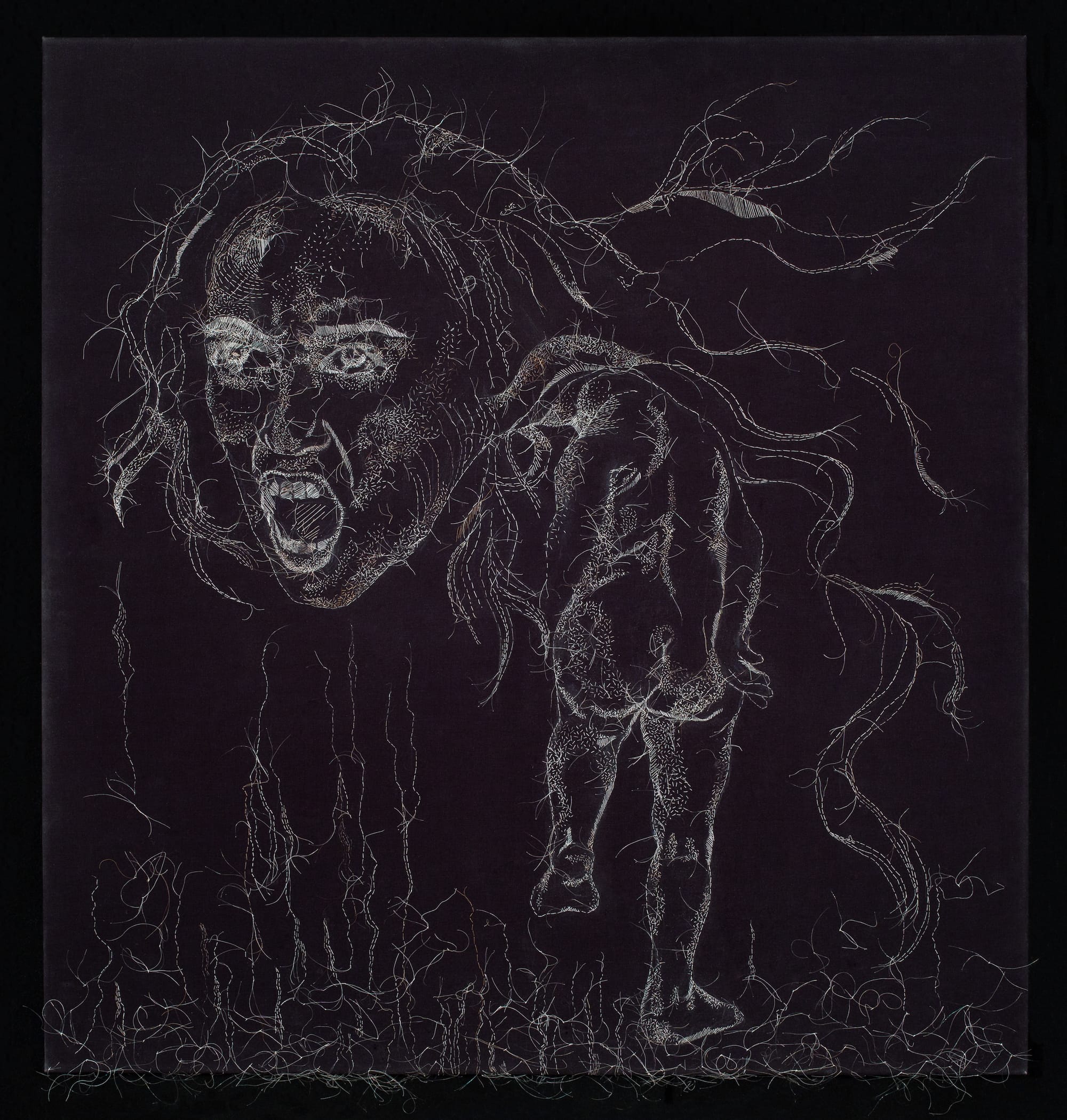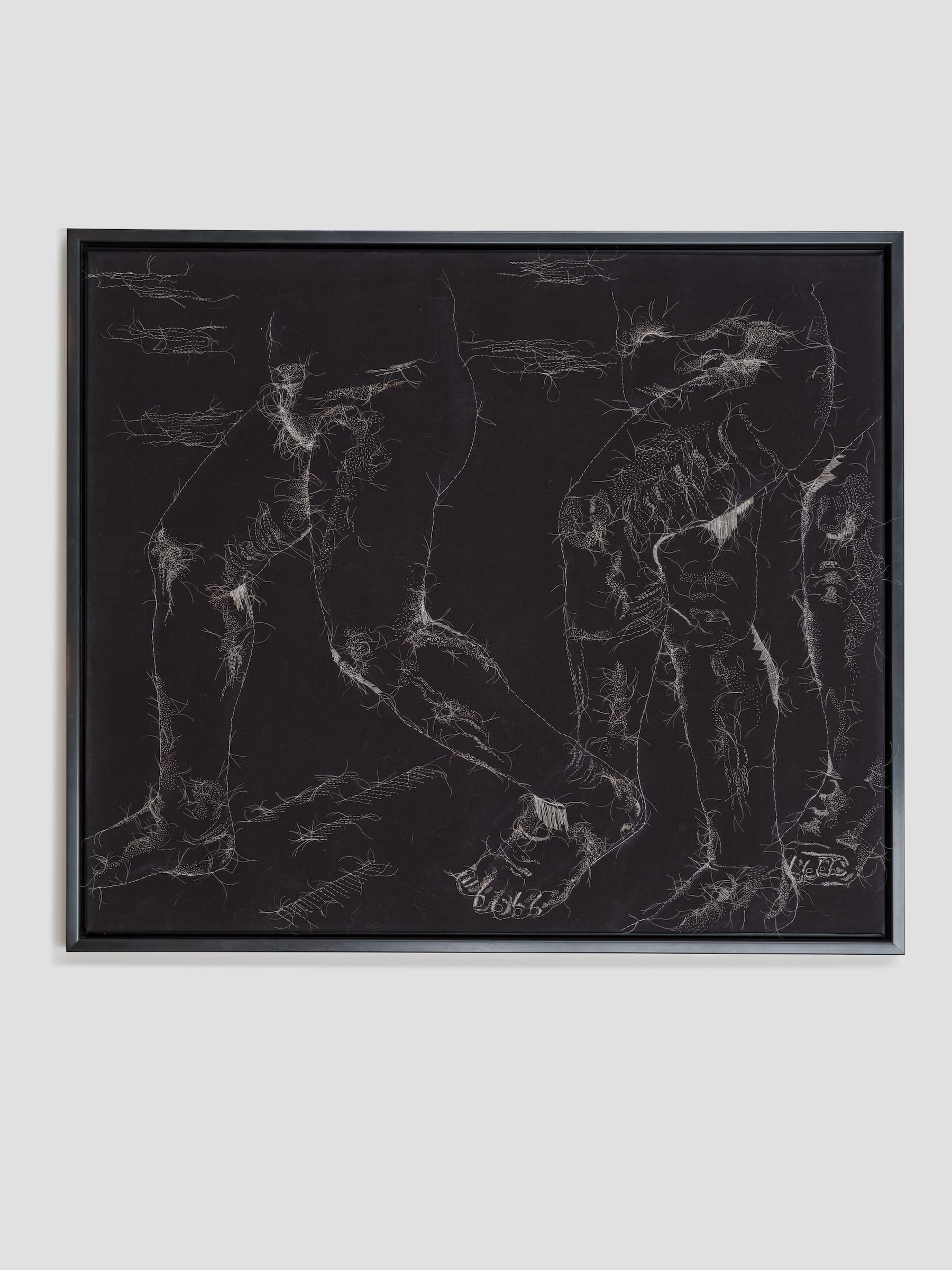 For example, in “Marching Across Your Lawn, the Grass Is on Fire” (2020), the artist refers to women’s use of marching as a political force. Drawing with silver hair on black fabric, she renders the fuzzy pubic areas, skin creases, and fleshy dimples of three women by drawing five legs mid-motion: two pairs in the center, depicted from the waist down, and a singular appendage, from the knee down, just entering the frame. One woman’s back leg and another’s front leg join to share a foot — the individual becoming part of a combined effort or movement.