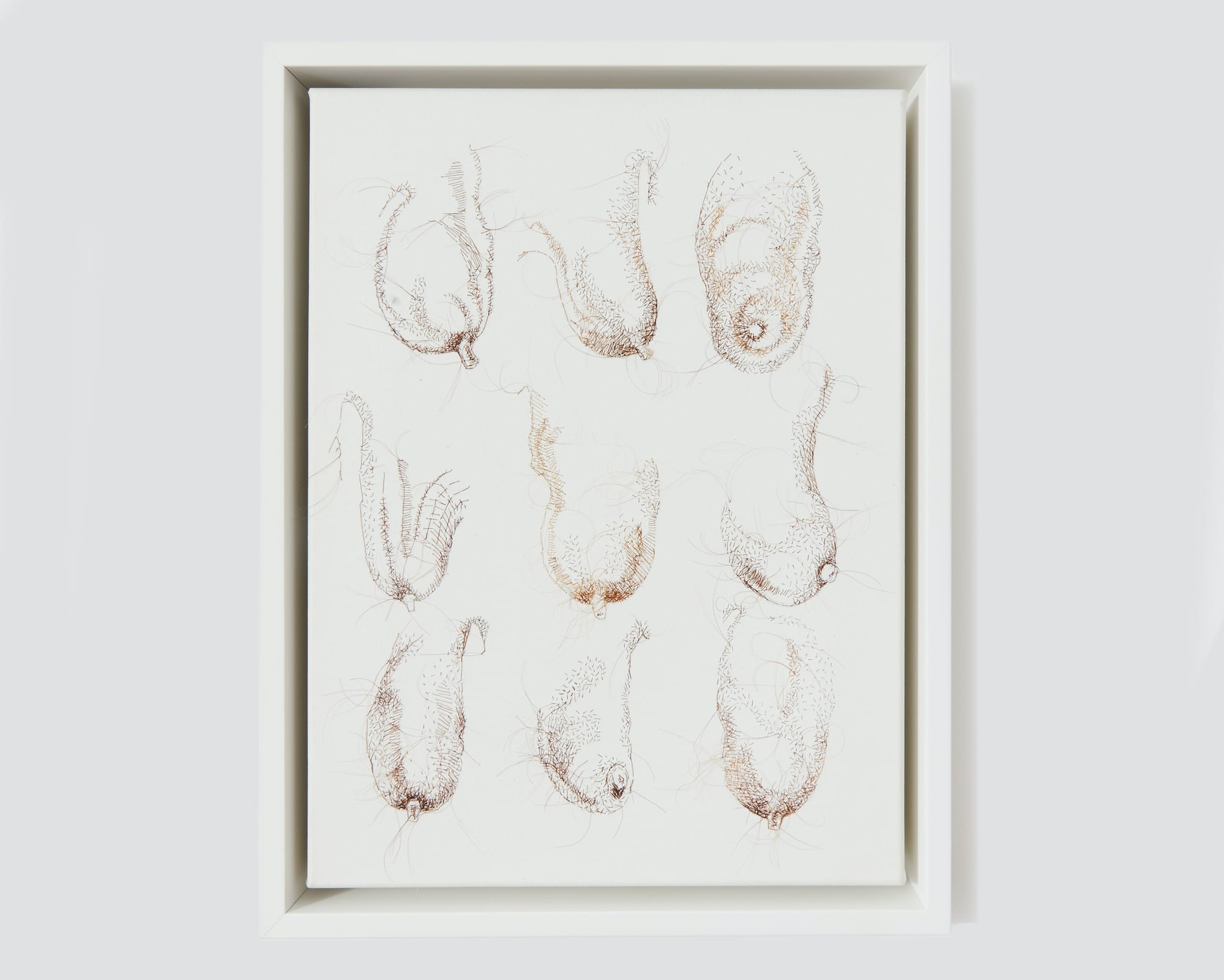 Nalgas, a Spanish word that translates to “buttocks” in English, makes appearances in My Hair Story: From Brunette to Gray, the artist’s retrospective exhibition at form & concept, as do other body parts. Naked and isolated, the body parts suggest vulnerability or “risky exposure,” Meza-DesPlas writes in her statement. Hair plays a central role in her practice, as well, as the exhibition title implies. For more than 20 years, she has been collecting her hair daily, using it as a drawing material in her portraits and figure studies, which examine the myriad roles women perform — or are expected to in our society.