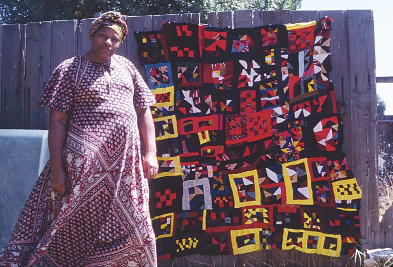 Even the pseudonym “Tompkins” was adopted to afford Howard privacy. One of 15 half-siblings in a family of sharecroppers, Tompkins, who was born in 1936, emigrated from the daily terrors oppressing Black Americans in the South at the age of twenty-two. In a Great Migration story that spanned the Jim Crow South of Arkansas to a nursing career and a family of her own based in Richmond, California, Tompkins fashioned herself as a working artist. She advertised on business cards as the maker of “crazy quilts and pillows.” (Crazy quilts are a recognized type of quilt that forego the careful geometry of traditional quilts in favor of irregular patterns and fabrics.) Beyond this biography, her story remains as enigmatic as her work.