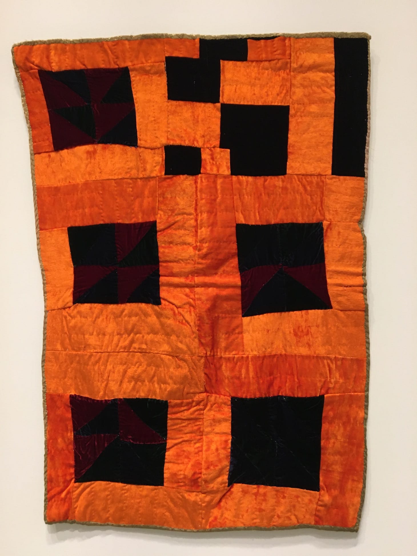 She punctuated many of her pieces with color contrasts, using black to introduce a sensation of loss or distance. Not the loss associated with death per se, but rather an unmooring from the body, a sensation of mind or soul floating in space. “The orange is me,” she once said in reference to a 1994 quilt that features a collection of black squares framed by orange, one square in the upper right-hand corner disintegrating — a deconstructed and eerie identification.