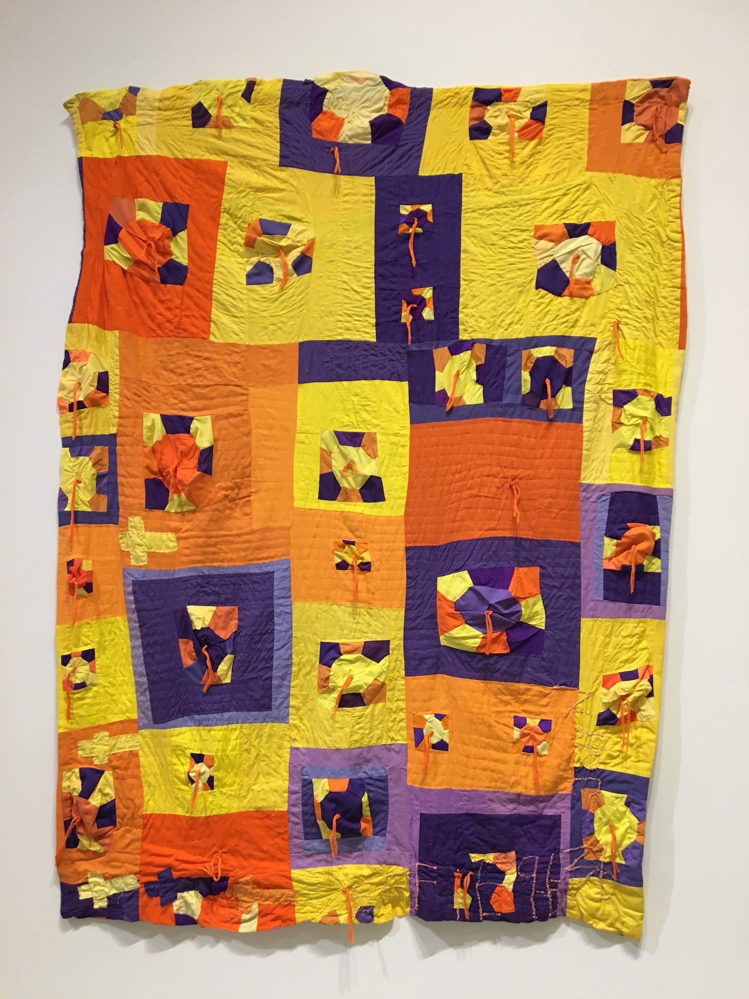 Tompkins had no attachment to the quilt as utilitarian blanket. Often, she worked exclusively on the surface of the quilt, where she patterned and pieced her design schemes, leaving the finishing, including the backing and routine construction, in the hands of paid workers. With a medium that promises comfort, Tompkins’s quilts disorient the senses. At BAMPFA, onlookers could pivot from four-foot wide pieces only to be engulfed by 10-foot-plus sized fabrics. She pulls her visitors’ eyes through color palettes that flow wildly from psychedelic oranges to spotlight yellow to outer space. “I think it’s because I love them so much that God let me see all these different colors,” Tompkins famously said.
