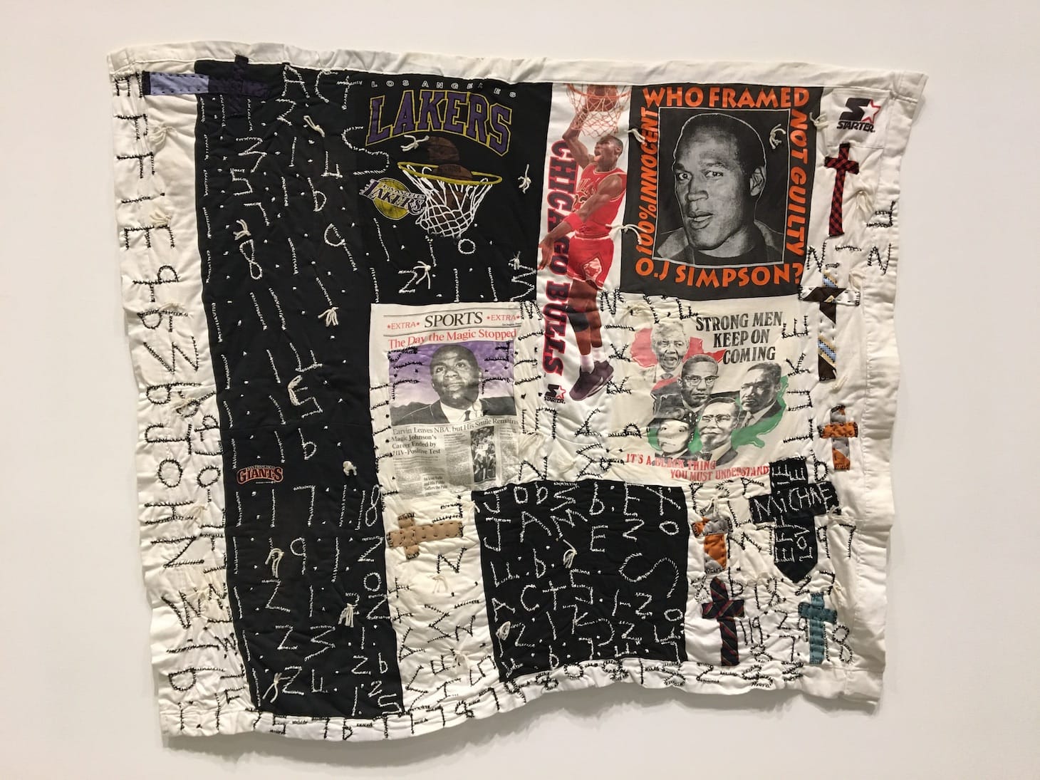 One of her rare figurative quilts reveals how Tompkins was unafraid to stand up for her communities. The quilt, made in 1996, prominently features Black celebrities, incorporating images of Magic Johnson, OJ Simpson, and leaders such as Elijah Mohammed, Nelson Mandela and Malcolm X, as well as a print reading “It’s a Black Thing/ You Must Understand.” In one corner, she appliqués a cross commemorating Michael Jordan with the word “love.” I believe that Tompkins would very much be down for the #BlackLivesMatter movement of today.