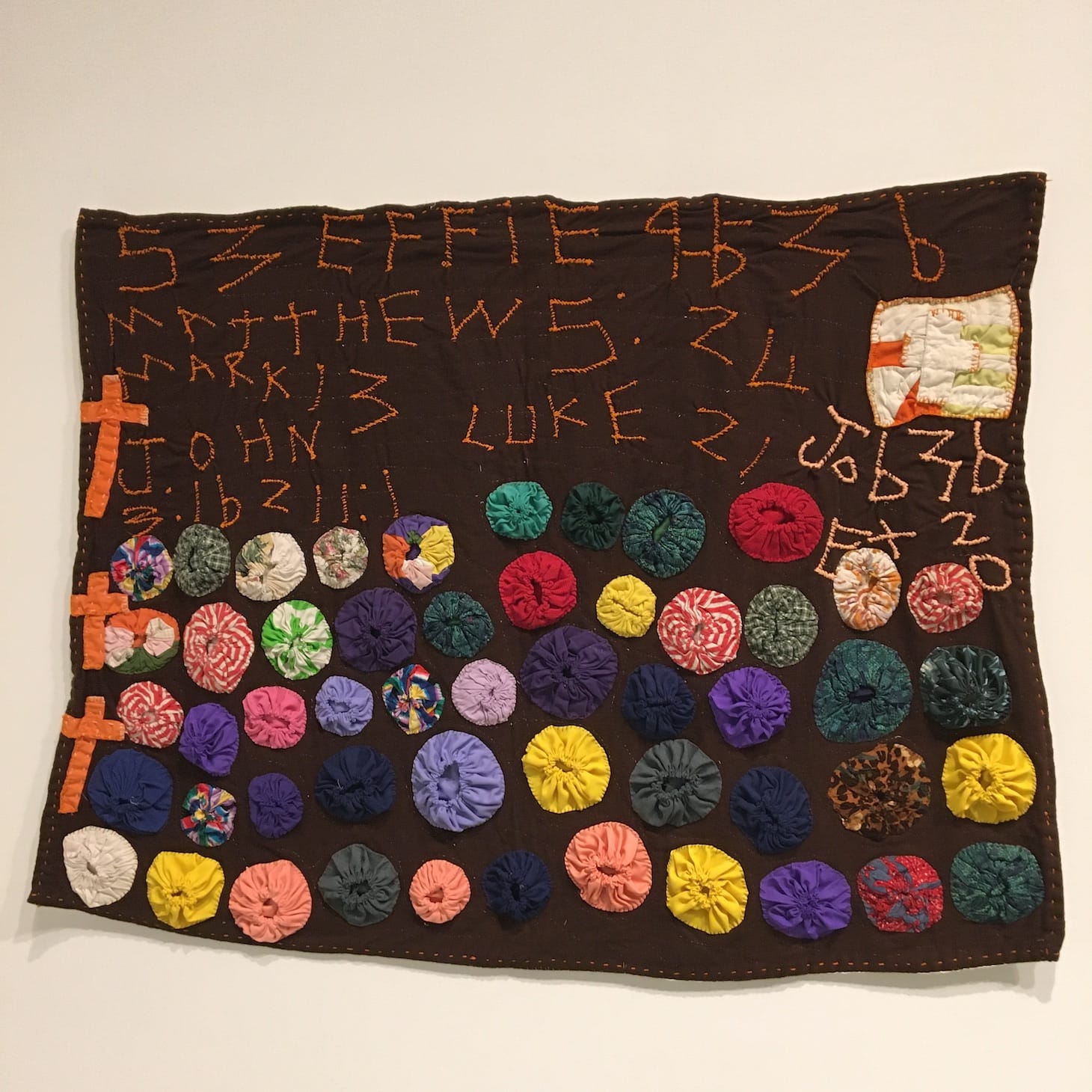 Tompkins developed an expansive and deeply personal cosmology. She possessed an idiosyncratic numerology, repetitively stitching her own birth date (“9-6-36”), or the birth dates of loved ones in several places. The number six emerges as a pattern. She scattered crosses and Bible verses throughout quilts (many of which also include the number six). One favorite was John 3:16. “For God so loved the world, that he gave his only begotten Son, that whosoever believeth in him should not perish, but have everlasting life.”