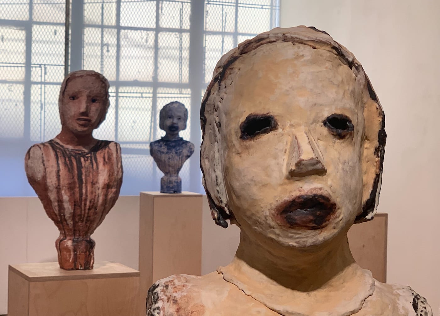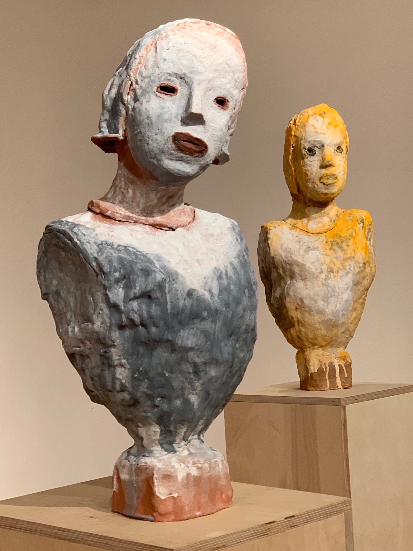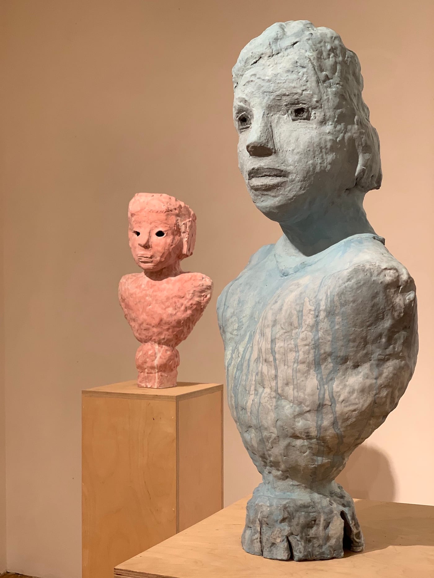 Of literal “rough edges” there are few, if any, among this cohort, as these busts are soft and modeled — convincingly fleshy. They might be roughed out, insofar as surfaces are slightly bumpy, forms a little lumpy, and glazes as provisional-looking as the handling of the clay itself.