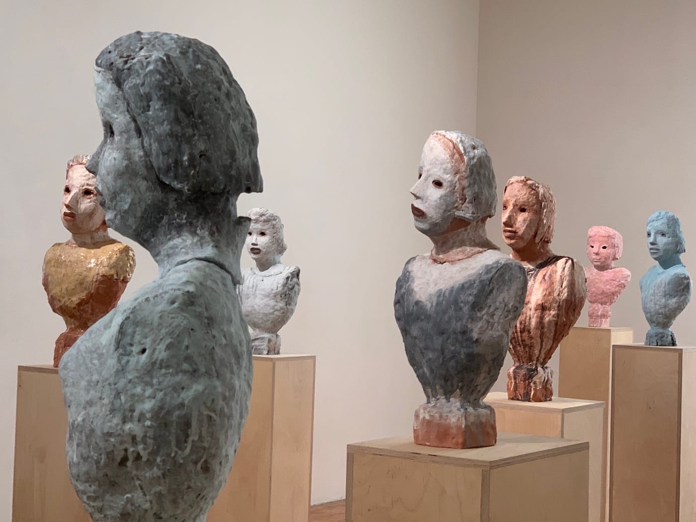 These glazes are mostly matte, whether they’re primly tinting a coif or neckline, or running deliciously in rivulets down a torso. Hints regarding hairstyle and costume locate all but one or two figures on the female side of the gender spectrum. Each is around two feet high and placed on pedestals that bring them to around eye level. They look at you looking at them.
