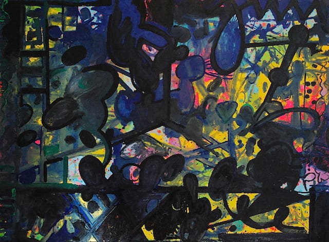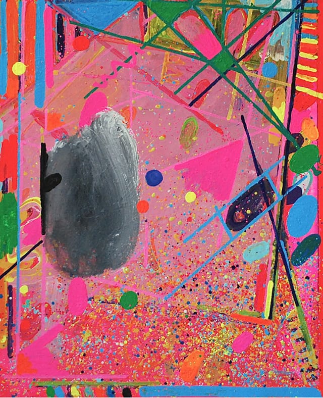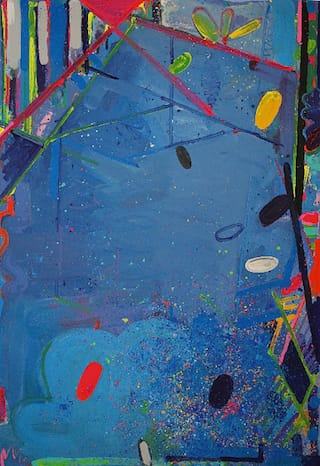 Like Robert Motherwell, Reginato does feel not compelled to overthrow his predecessors, which includes early modernists such as Paul Klee, Wassily Kandinsky and Joan Miró, as well as the Abstract Expressionists and Color Field artists. He has absorbed possibilities from a wide field of art history and made of those artists he loves something all his own. He employs a variety of means, from drawing in paint to laying down a field of variously sized splashed dots. The palette is largely primary and secondary colors, with an occasional black or gray. Curling lines, like giant scribbles, convey an unexpected joyfulness, while the shapes and splashes of paint seem to float in ambiguous space that underscores underscore a world which has not hardened into a fixed image or literal surface.