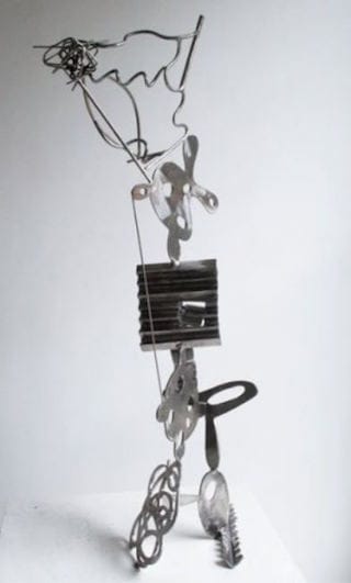 Known for his polychrome sculptures, these works are further proof of Reginato’s expansiveness. Assembled out of twisted wire, an accordion-like plane, and pieces of metal the artist has cut, the undated “Thin Woman” resides in that space between abstraction and figuration without tilting into either. This ambiguity is also true of a number of the paintings, which can be read as rooms as well as loosely painted, geometric abstractions. Reginato is one of the few artists that I know of who is successful at employing what I think of as the kitchen sink approach, where anything goes. And yet, instead of becoming ponderous, as some of Frank Stella’s behemoth constructions can be, Reginato’s unruly work conjures multiple readings with a graceful intelligence.