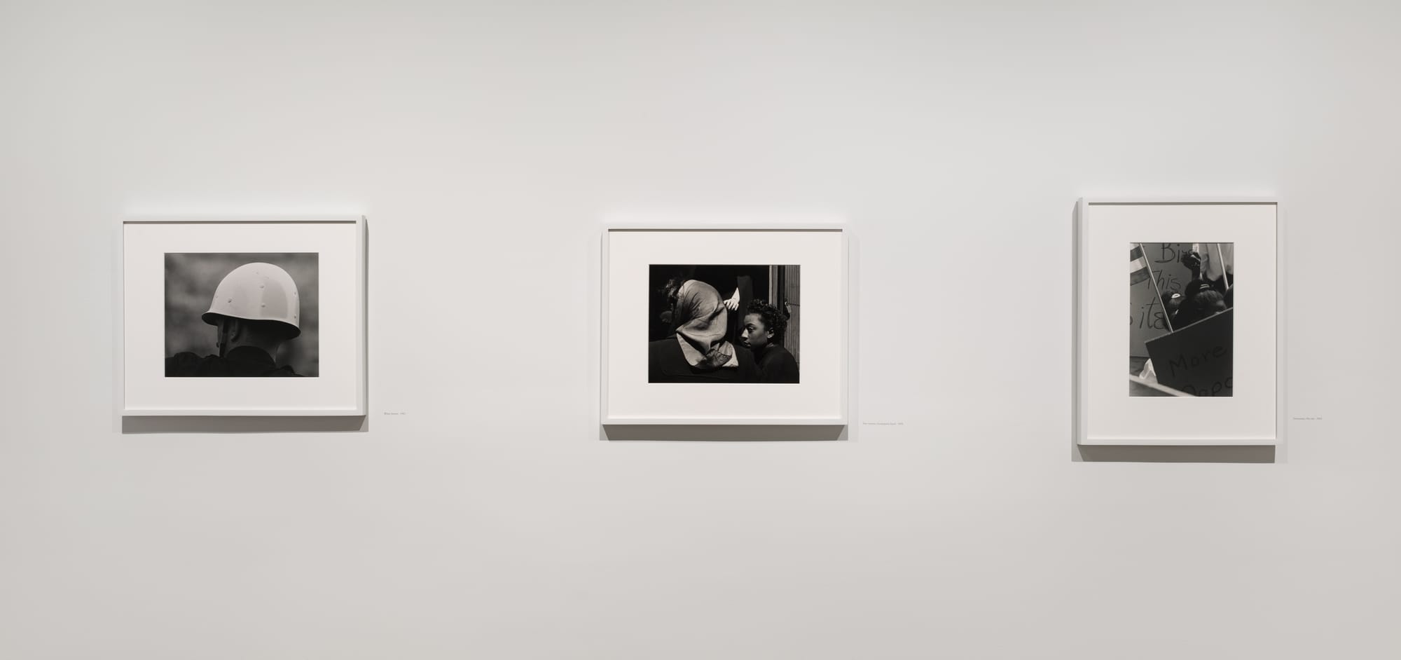 In DeCarava’s photographs, the love and intimacy between Black people, alongside the inequality and alienation of cities, paint contrasting views of American life. While not overtly political, these works, when considered in context, point to or signify political injustices. “White helmet” from 1963 might resemble a simple object study, but the subject is immediately recognizable as the white helmet worn by police officers deployed to quell urban rebellions and civil rights protests during that period. The white helmet reappears in “Progressive Labor,” a snapshot of 334 Lenox Avenue taken in the year following the Harlem uprisings of 1964. A policeman stands patrol in front of a grocery store, located next to what appears to be an office of the left-wing Progressive Labor Party. As one man to the left stares warily at the police, an illustrated poster depicting police terrorism of Black people hangs above the storefront and mimics the reality at street level.