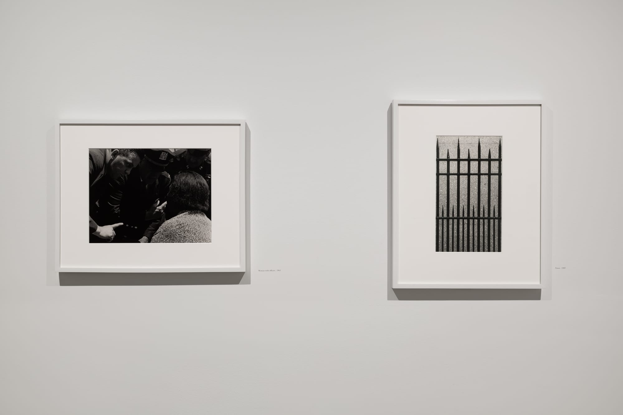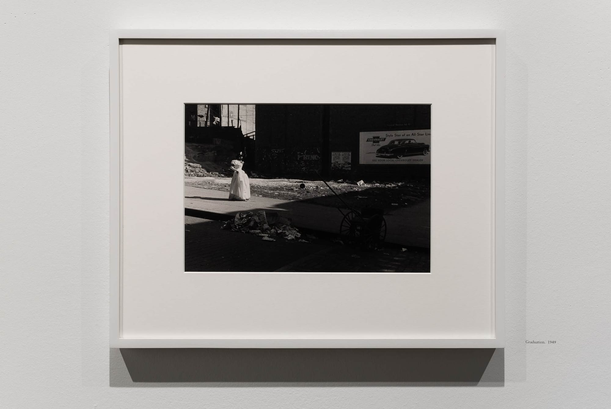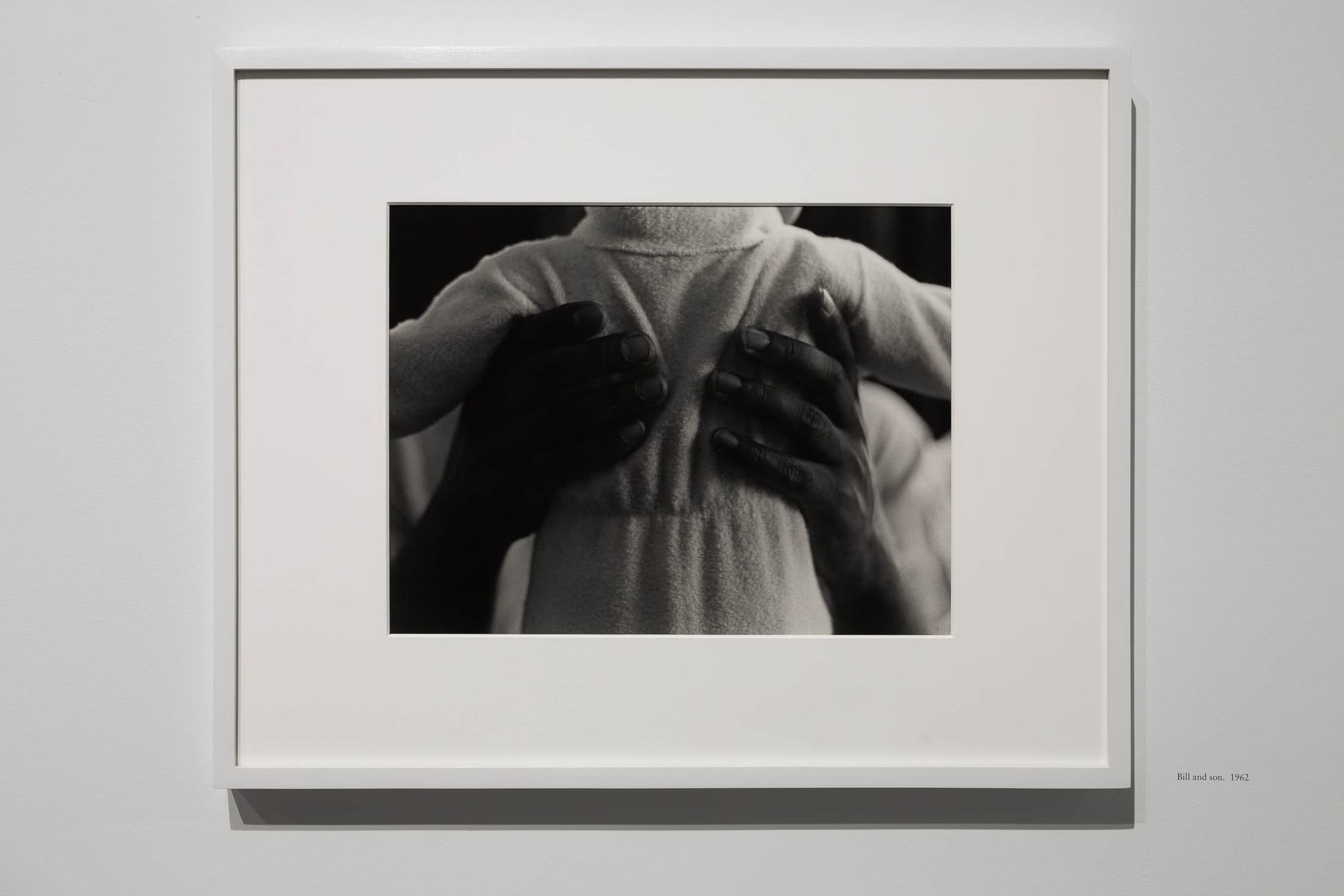 A father’s hands hold up an infant child in “Bill and son” (1962), while a mother stoops down to eye level with her daughter who sits passenger side in a car in “Woman and girl at car window” (1979). In the latter image, the woman is dressed professionally and has a stack of papers in her lap as if she’s about to enter a job interview or business meeting. Whether she’s reproaching or comforting the child is uncertain, but the photograph portrays the woman performing two jobs at once — the obligations of parenthood and professional life.