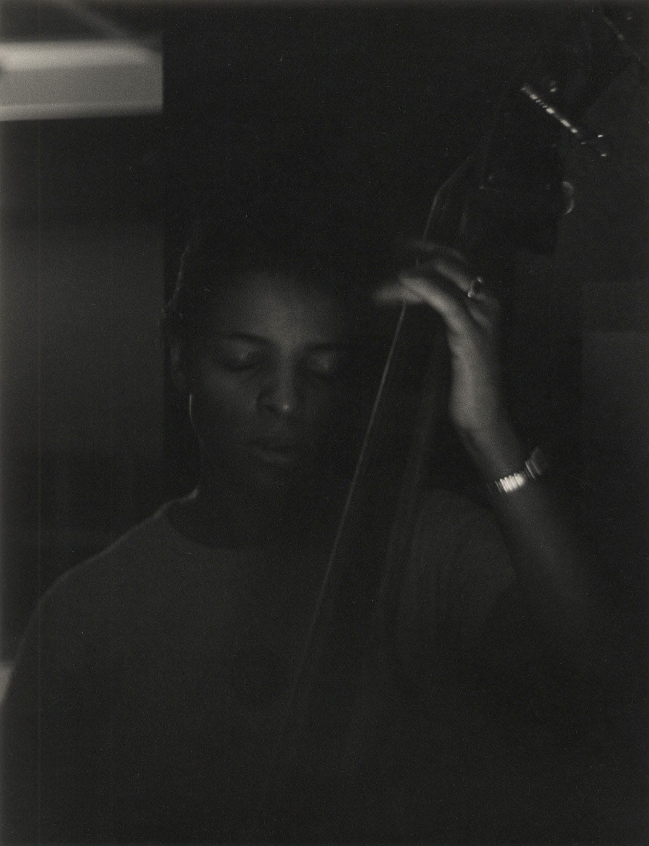 In spite of these realities, Black American life as it appears in Roy DeCarava’s photographs are full of beauty and mystery. A photograph from 1950 captures another musician at work, this time a performance by bassist Edna Smith. Her left hand holds a note on the upright bass, her serene and meditative expression lit by a soft glow. The sounds from that evening and what she’s thinking or feeling are likely lost to time. Details on the bass player’s life are also scant, unlike those of DeCarava’s other subjects, like John Coltrane. But here in this image, she’s not just playing the rhythm section but is the star of the moment, one of many famous and unknown jazz players who performed in the clubs of DeCarava’s mid-century Harlem.
