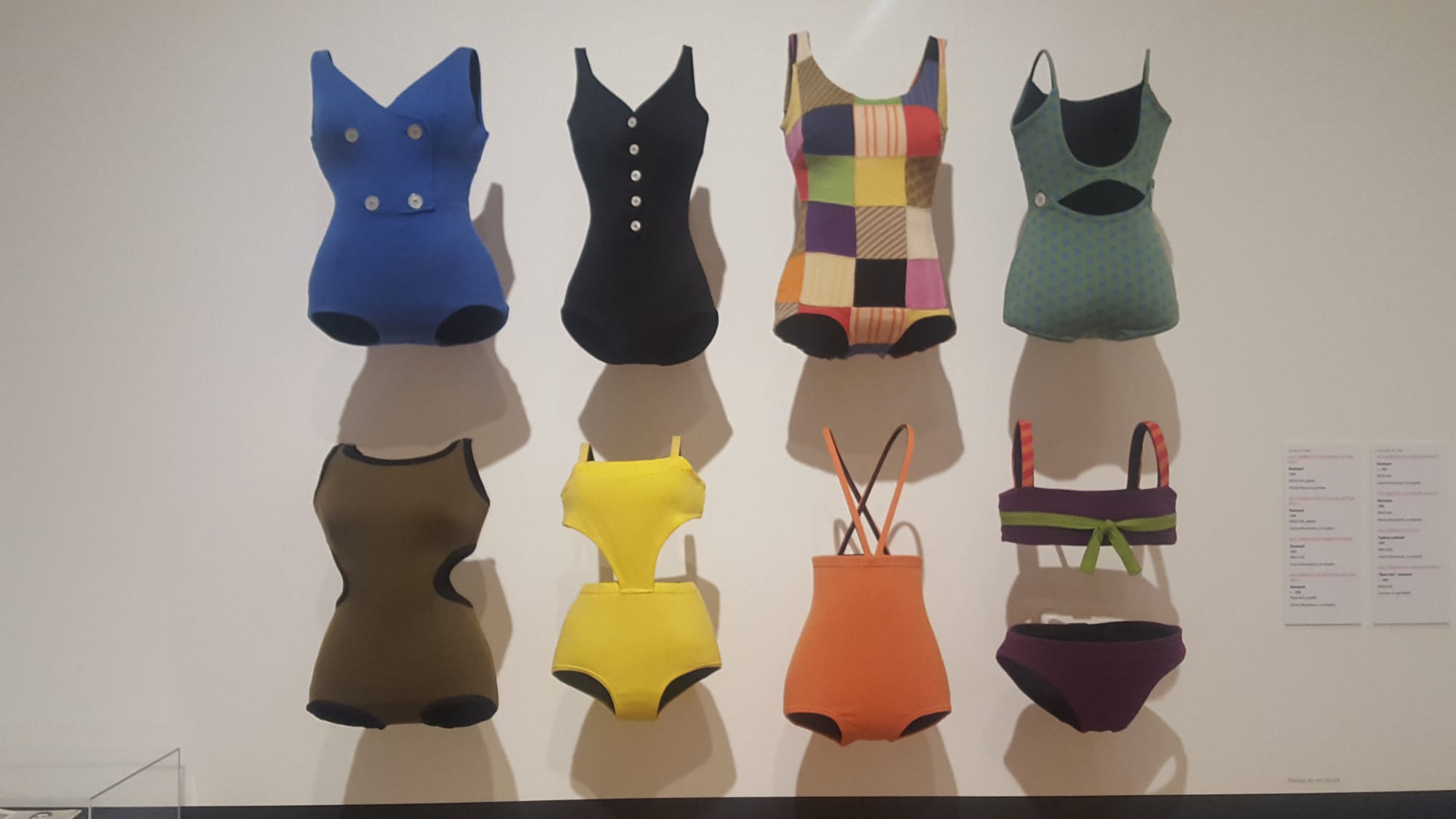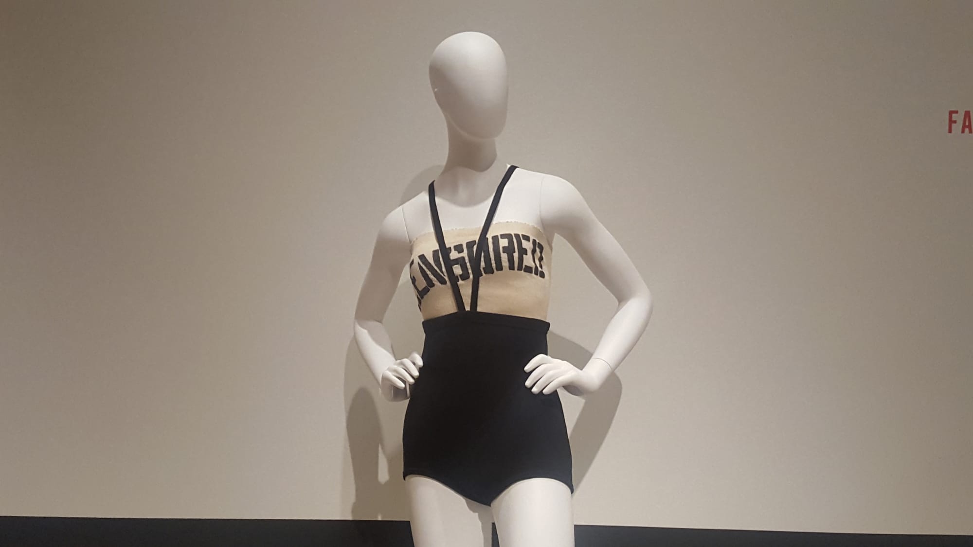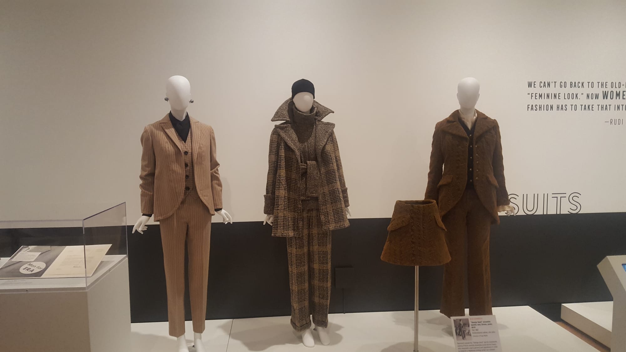 Gernreich experimented with making clothing as a political statement. One section of the exhibition presents a military-styled ensemble he created in protest of the Vietnam War. (Alongside it is a video of the original model speaking about how she thought that releasing the piece so soon after the Kent State massacre was ultimately in poor taste.) His thong designs (for both men and women) were a direct response to Los Angeles banning nude beaches in 1974. His work puts an entirely different spin on the idea of the personal being political, making the body itself into a statement.