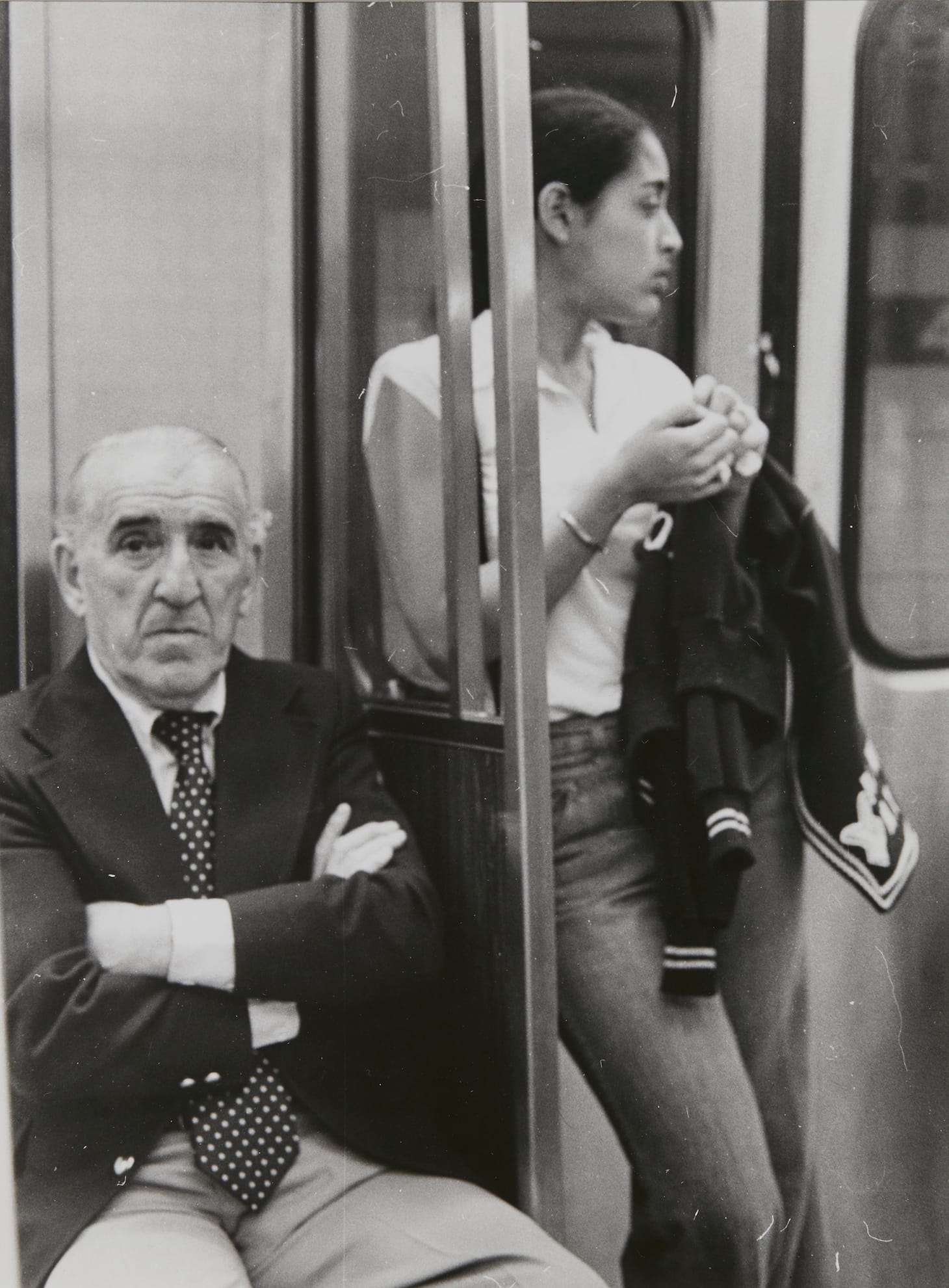 The etiquette of looking and not looking, of being intrusive or minding your own business, is a constant dance in New York, especially on the subway. Walker Evans hid his camera in his overcoat with just the shutter peering through two of the buttons, and often was accompanied by fellow photographer Helen Levitt. Taken between 1938 and ’41, his series Subway Portraits is routinely described as “candid.” There is something ironic about this view, because Evans is secretly taking the photographs and there is nothing particularly candid about that.