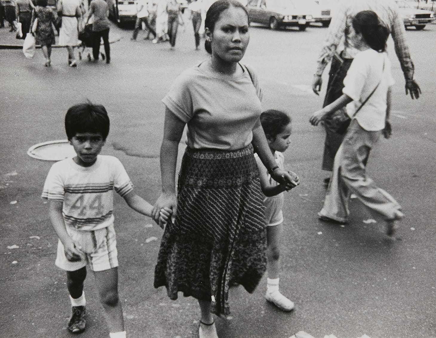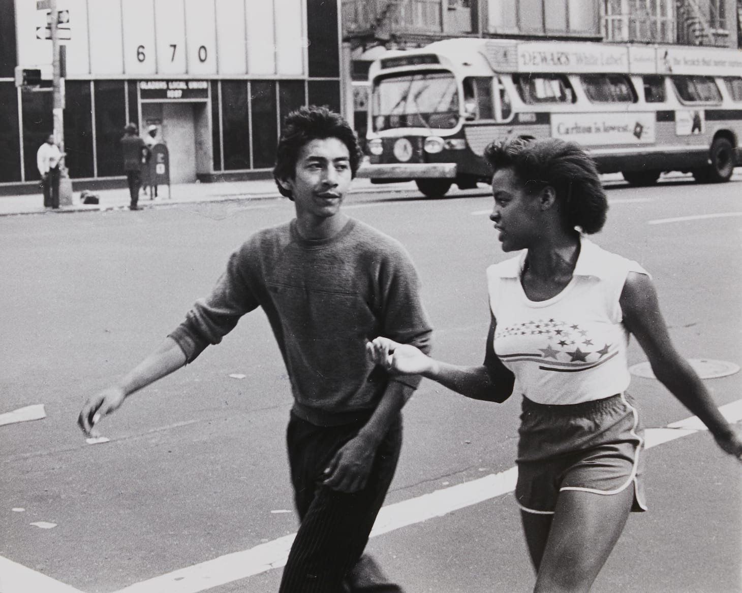 The themes of isolation and estrangement are absent from Burckhardt’s photographs. He was drawn to scenes such as a mother holding her child as they cross a street or a young couple on their way somewhere. They are dressed casually. His subjects are often people of color, who express trust in this older white man taking their photograph.