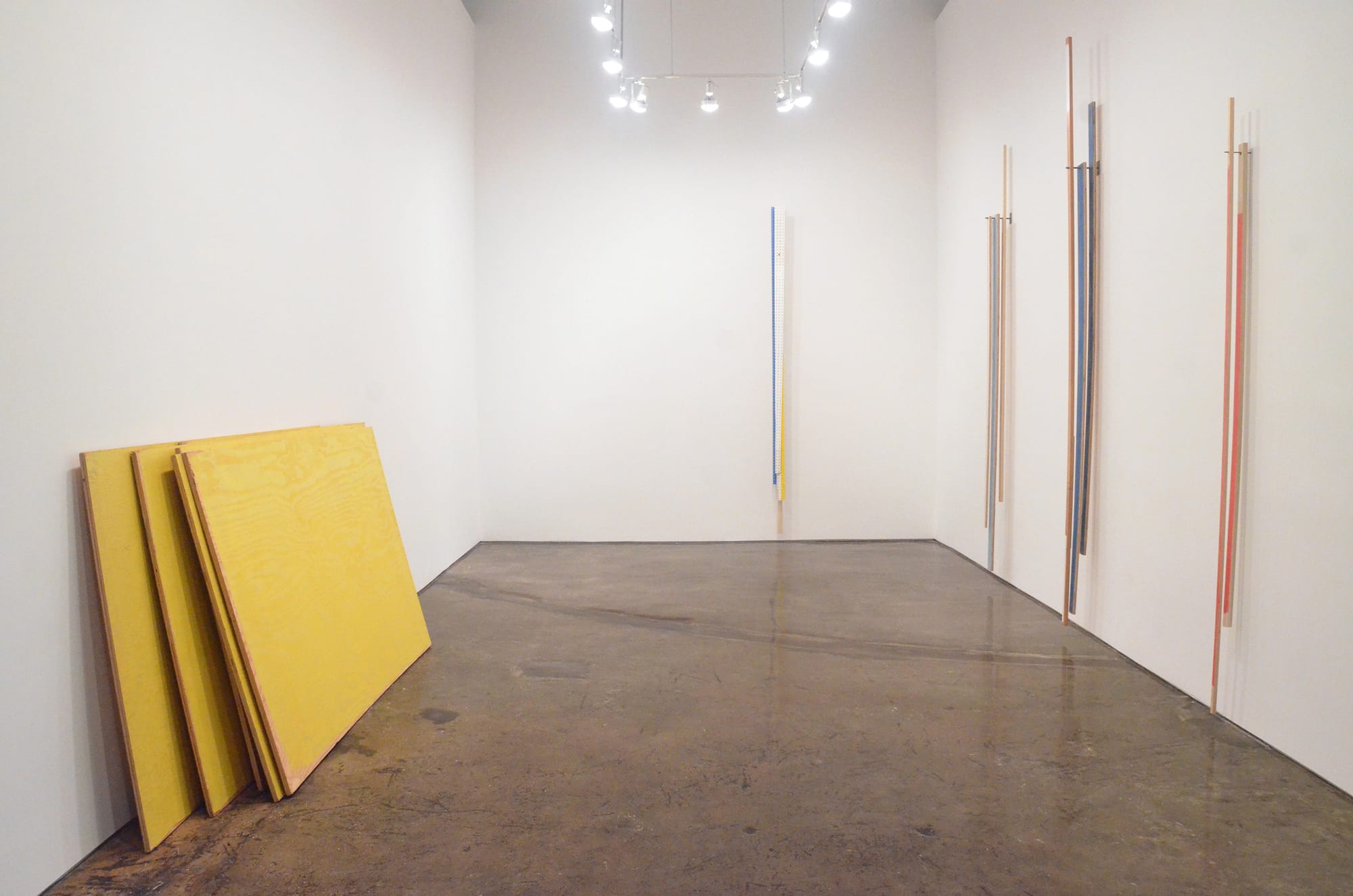 The oldest work in this beautiful, invigorating show is “STACK-Safety Yellow” (1985/1992), which consists of six hefty sheets of plywood painted (but for a slim margin at the edges) with yellow traffic enamel and horizontally arranged, with a misleading appearance of effortlessness, against the wall to a length of nine feet.