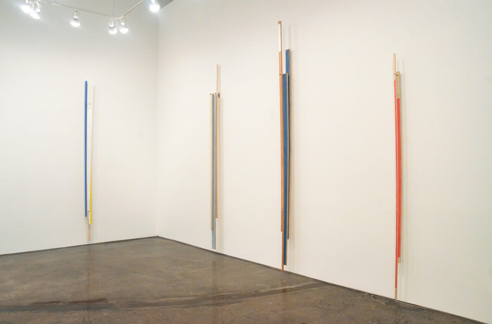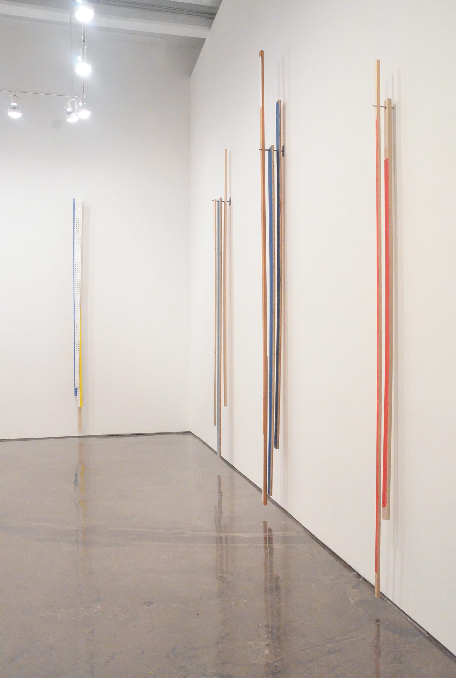 The Needles are made with various combinations of enamel, acrylic paint, and polyurethane on thin strips of wood, plywood, and/or pegboard. They become noticeably narrower toward the bottom end, which is perhaps two inches from the floor. The length of the bracket (and thus the third dimension of these works) is seven inches.
