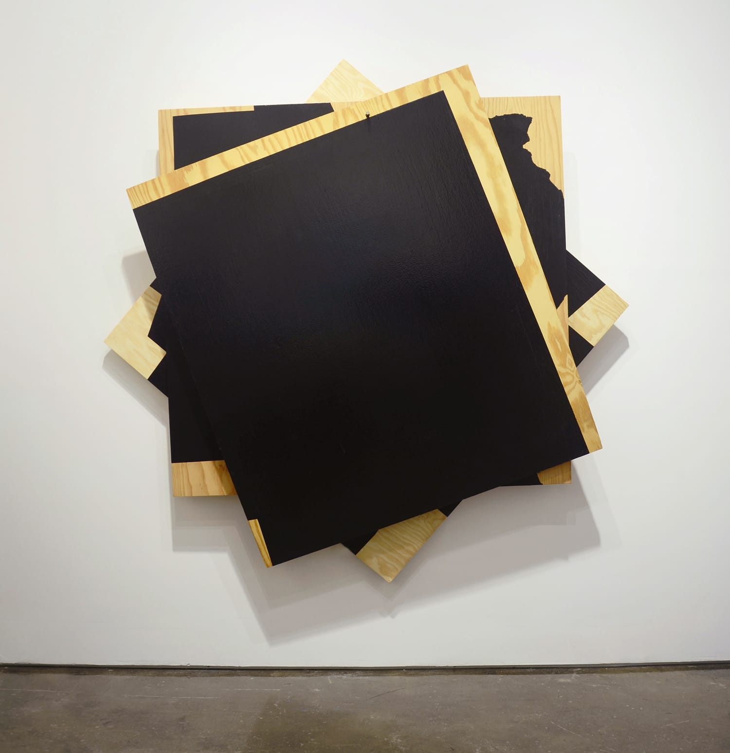 “S.P./BK #113” (2013) harnesses the force of gravity as a compositional device. It consists of three squarish plywood plates suspended from a steel post bracket protruding from the wall. The bracket is inserted through holes drilled into the sheets of plywood, and owing to the varied placement of the holes relative to the panels’ center of gravity, the wood splays as it sags, forming an irregular 12-pointed star.