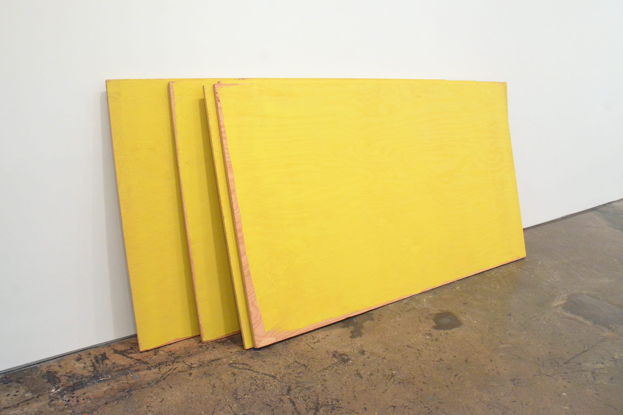 The oldest work in this beautiful, invigorating show is “STACK-Safety Yellow” (1985/1992), which consists of six hefty sheets of plywood painted (but for a slim margin at the edges) with yellow traffic enamel and horizontally arranged, with a misleading appearance of effortlessness, against the wall to a length of nine feet.