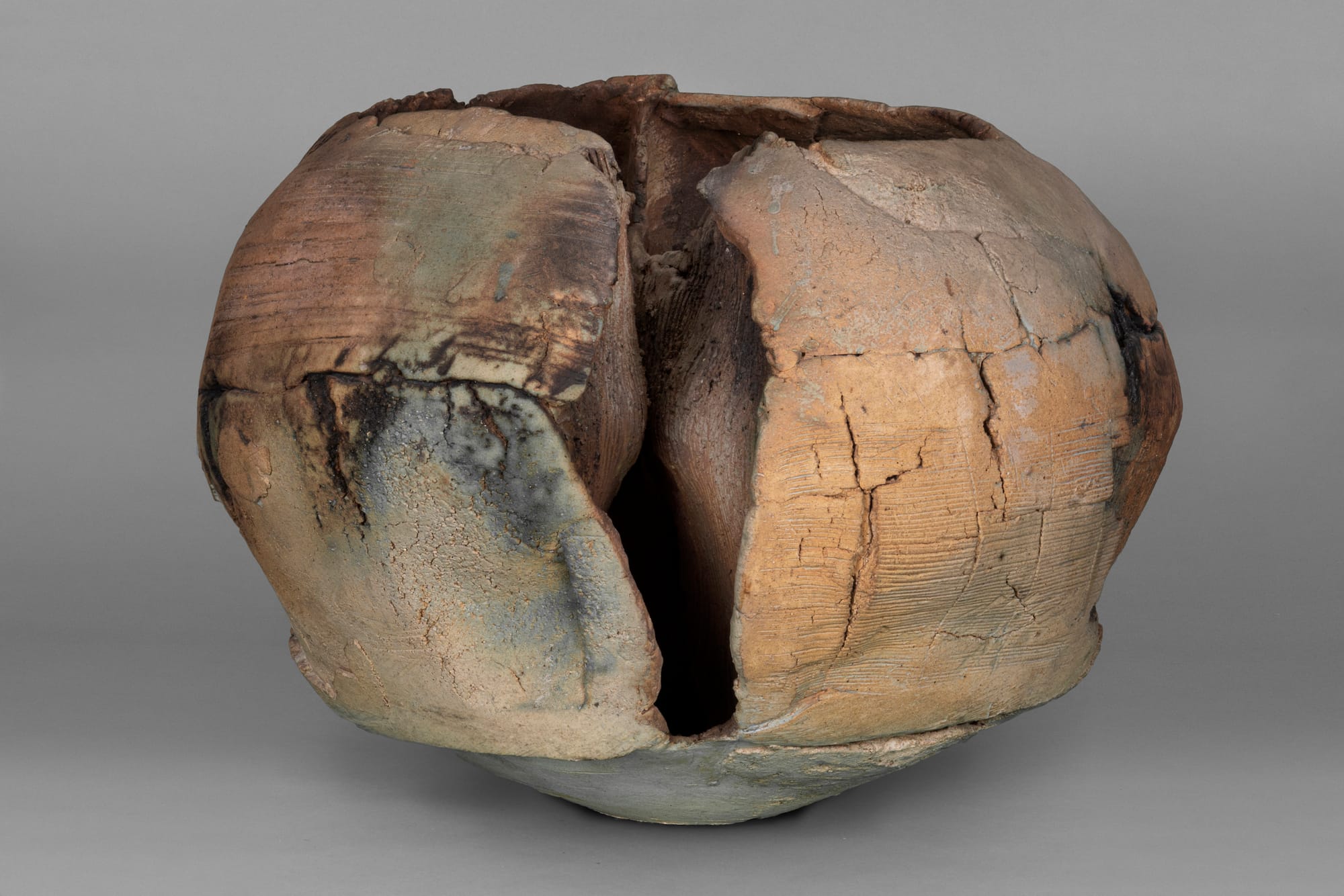 CHICAGO — Among the 58 artworks in Ruth Duckworth: Life as a Unity at the University of Chicago's Smart Museum of Art, three stoneware vessels, drawn from her Mama Pot series, exemplify how Duckworth’s work defies art critical hierarchies. These pots evoke domestic uses associated with pottery yet resemble ancient ritual ceramics. Lacking such cultural backstories, they emerge as self-contained meditative sculptures hinting at fragility, with curvaceous shells disrupted by roughly serrated rims, web-like craquelure, and biomorphic slits and crevices.