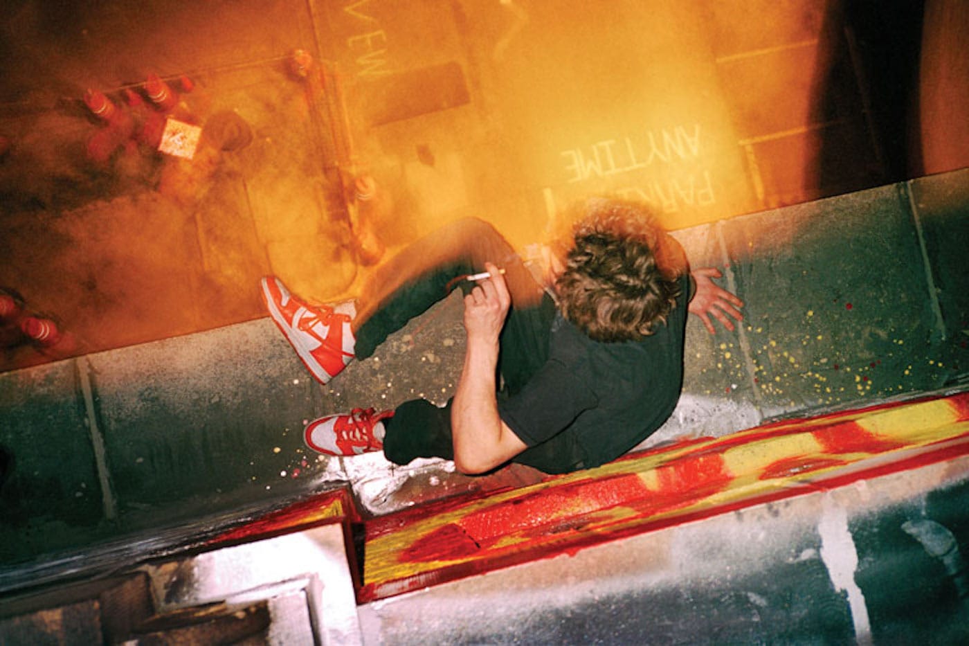 The photographs McGinley produced between 1998 and 2003 blur the space between spontaneous and choreographed. In some images, the subjects stare at the camera directly while bleeding or rolling a joint. In others, backs are turned while the subject marks a brick wall with graffiti, unconcerned or unaware of the shutter’s clicks. This shifting perspective yields an improvised nature. In “Sace (Canal Ledge)” (2001), the camera is positioned directly above cult NYC artist Dash Snow, who is smoking on a wall ledge. Only Snow’s youthful wavy hair, black clothing, and bright red and white sneakers are identifiable. A parking sign and a few spray-paint cans are blurred behind a tangerine-tinted fog that bleeds into the image from the top of the frame’s edge. The effect conjures the sensation of a memory rather than a documentation of an evening. This outcome was involuntary. McGinley worked with a Yashica T4, a 35mm compact camera with auto-exposure, which disallowed artistic manipulation. However, reading this early work as free-spirited in both process and content would neglect the discipline McGinley established only a few years after picking up a camera.