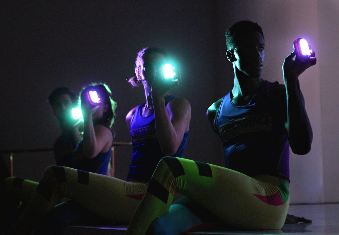 Seven dancers — men and women alike dressed in black sports bras and hyper-color Lycra tights, later donning T-shirts printed with their own faces — perform movements in that pastiche way McNamara has become known for; they form tableaux, they line up like a blasé chorus line, they move in canon, they prance, they body-roll, they make staccato angular arm gesticulations, they smack their hips with their fists like video clip backup dancers, and they take a break to drink water from water bottles in a severely formalized manner. The movement drifts between liturgy, go-go dancer, and vacuous model posing, but the dancers remain focused on simply executing the movement as they alternate between states, free of expressive embellishment.