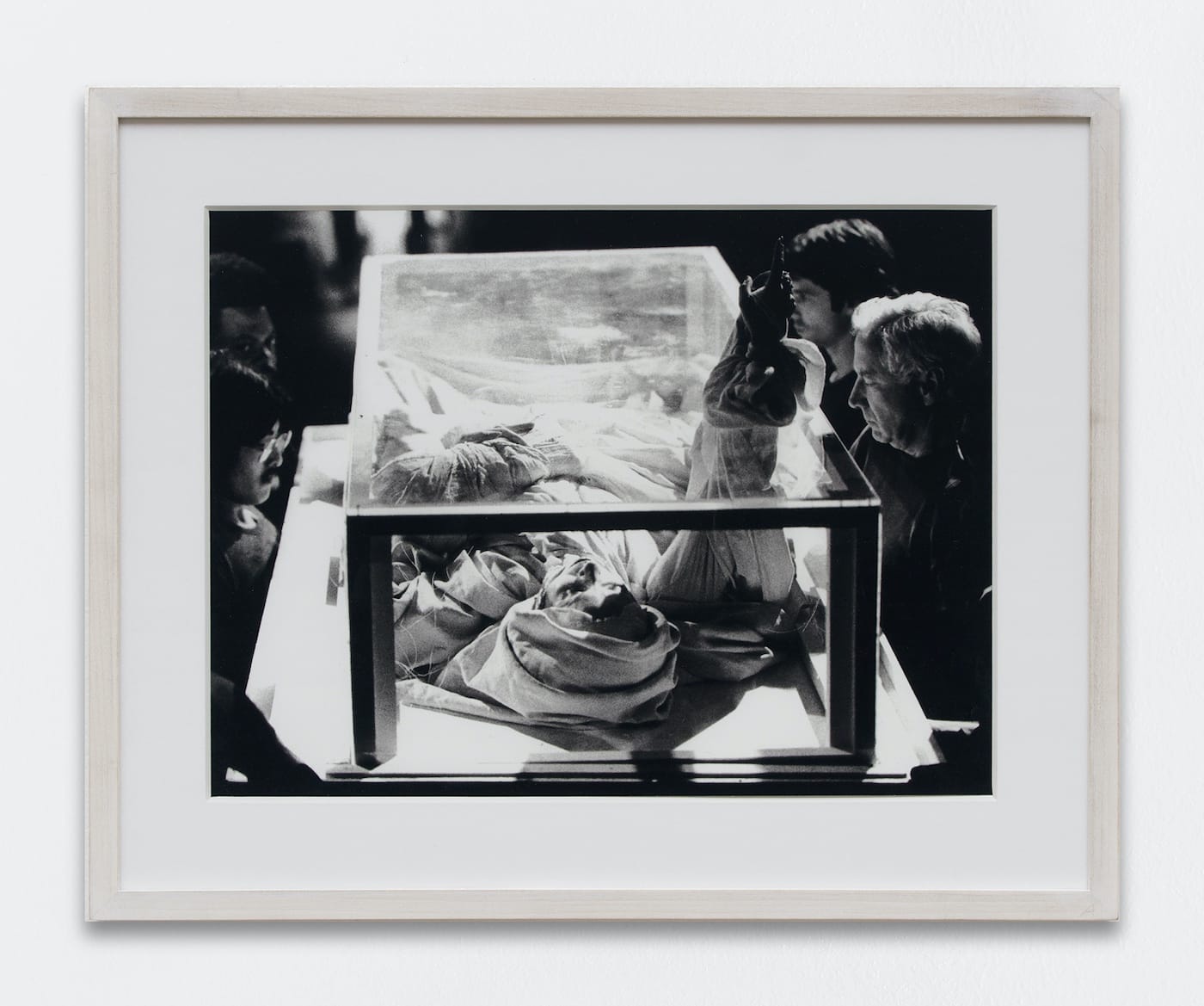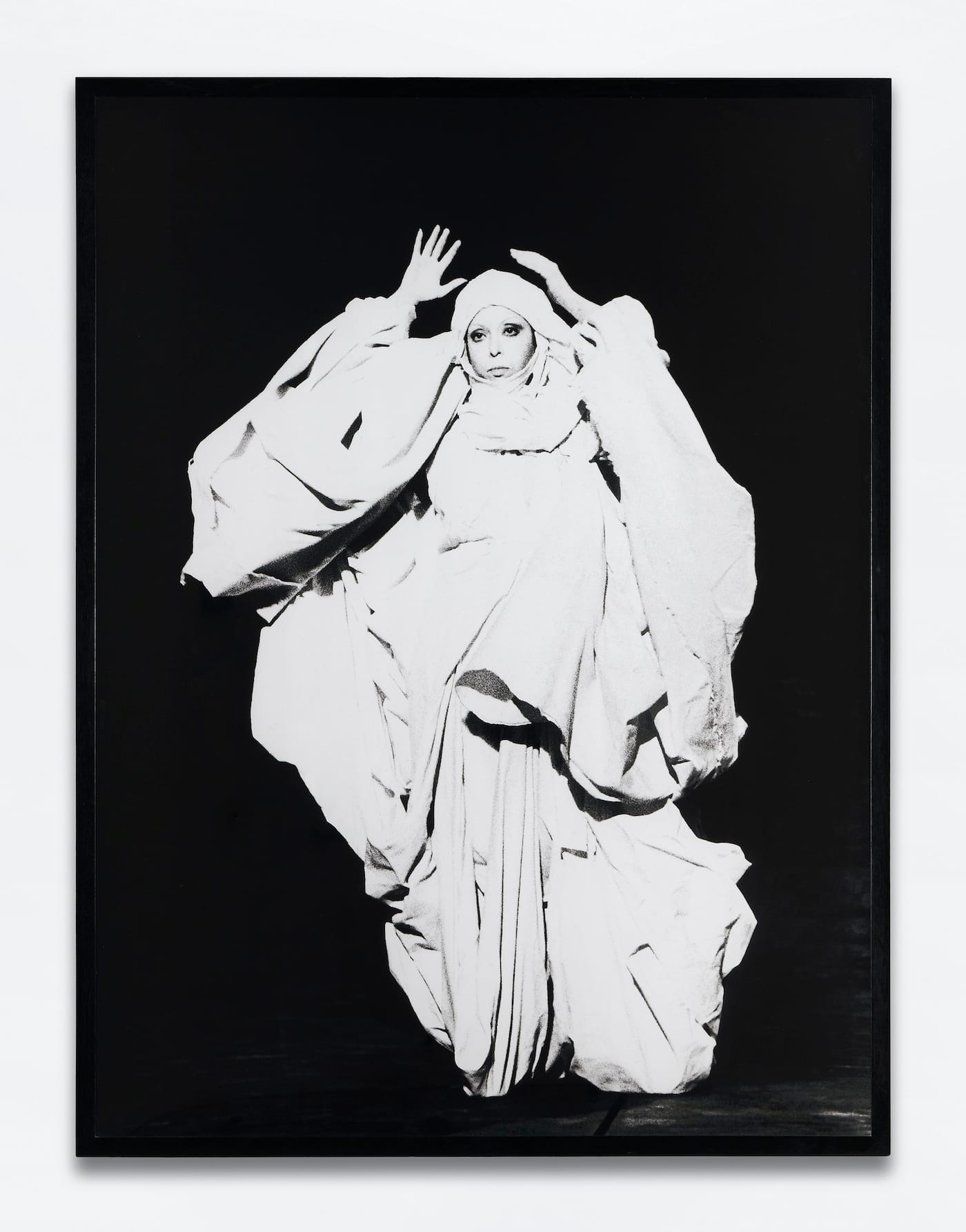 One dominant presence in the show was a large, voluminously filmy photograph showing a woman a-swirl in baroque drapery. This memorializes a live performance at the Palazzo Grassi in Venice in 1979, during which ORLAN was carried in a plexiglass shrine and bared one breast. “All my works are made to play with the notion of AND. Like the good and the bad, the true and the false,” she says. “That is why I like maquillage and mascara and at the same time, something very profound, which was the transformation of my body into a new sculpture.