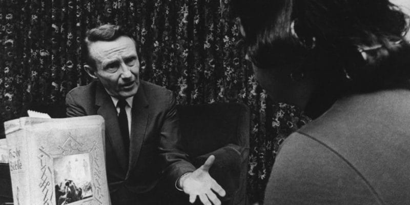 The Maysles and Zwerin do not explicitly condemn the salesmen for their or their industry’s callousness. Interactions between them at motels or on the road humanize them, demonstrating the job’s demands of physical labor, constant travel, and separation from their families. The wear and tear are most apparent with Brennan, who is demoralized by his downward trend. They are not innocent, but a more illuminating peek into the corrosive power that can arise within commodified Christianity comes via an all-company sales meeting which the foursome attend in Chicago. There, the “theological consultant” for the Bible they are currently selling speaks to the crowd. He says that their work is aligned with “[their] Father’s business,” making a farfetched comparison to Luke 2:49, wherein a young Jesus is separated from his parents and eventually found in a temple conversing with scholars.