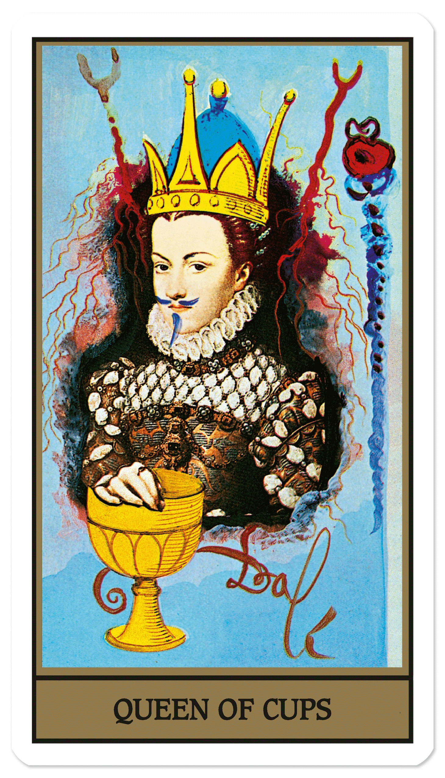 The deck’s 78 cards combine classic tarot themes with Dalí’s signature motifs: dissected faces, ants, roses, and butterflies. The deck features the artist himself as the Magician, while his wife poses as the Empress. Dalí’s Ten of Swords card — which can represent betrayal, backstabbing, or the death of a relationship — is a depiction of the assassination of Julius Caesar. The Queen of Cups is a play on François Clouet’s portrait Elisabeth of Austria, Queen of France (circa 1571), whom Dalí dresses with a goatee and mustache. The Moon is a woman’s face looking down on at a modern metropolis and Death is an ominous skull in a floating, cut-off cypress tree.