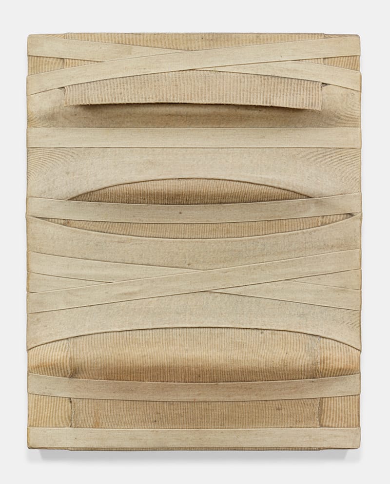 Living in postwar Italy, Scarpitta was friends with Alberto Burri, Lucio Fontana, and Piero Manzoni. In Rome between 1957 and ’59, he shared a studio with Cy Twombly. The works in the exhibition Salvador Scarpitta 1956 – 1964 at Luxembourg & Dayan (October 13 – December 23, 2016) mark the beginning of the trajectory of his career. In these early works, comparisons are often made to his friends Burri, Fontana, and Manzoni, without sufficiently emphasizing the differences or, equally badly, simplifying the differences: Burri’s work is about wounds and Scarpitta’s work is about healing. While his use of bandages lends itself to this reading, I think it becomes too reductive. Are they bandages or swaddling or, to my mind, both — birth and death wrapped together into one portable thing, at once ungainly and elegant. Don’t we live between both, carrying aspects of each? Don’t these early works prefigure the sleds he began making in the 1970s from things he found on the streets of New York and wrapped in rawhide? Aren’t his race cars— the first of which he built in the early 1960s — a metaphor for trying to outrace death, knowing that you can’t? Don’t race cars go round and round in circles, stuck in whatever loop they are confined to?