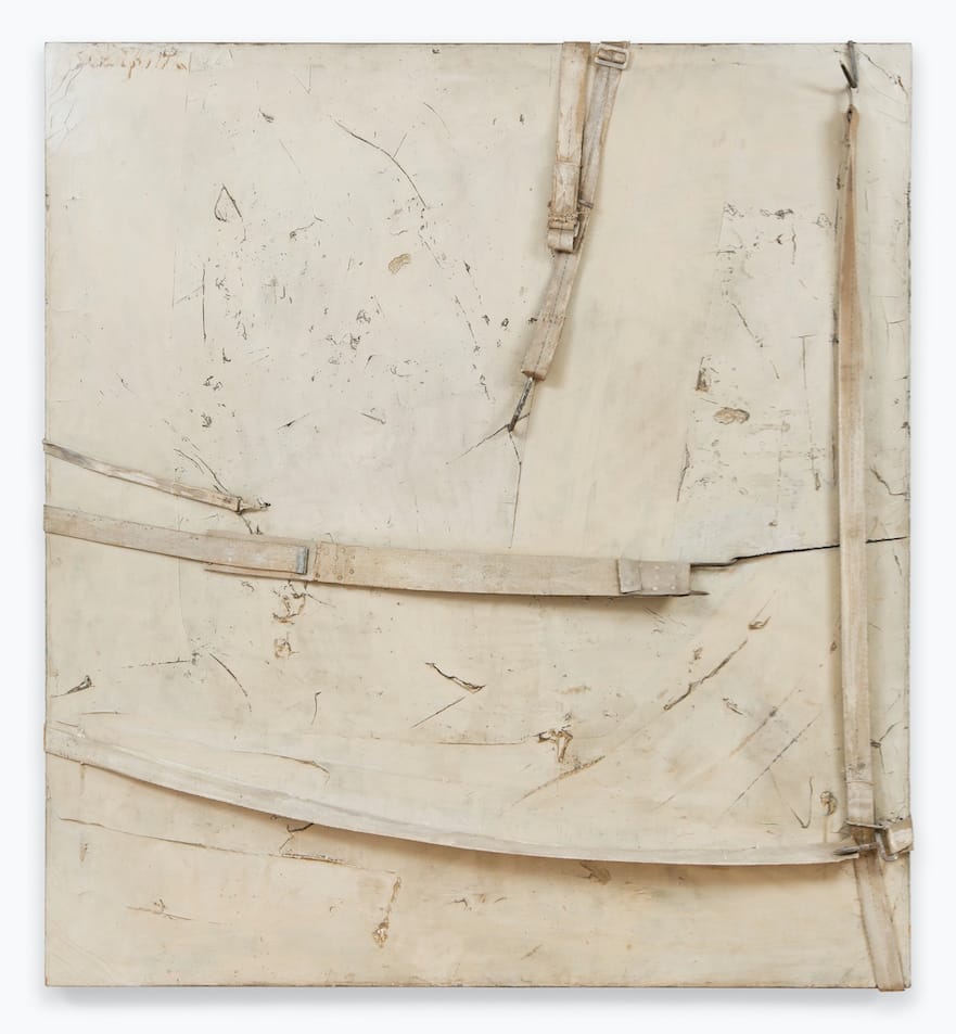 More importantly, within this early group of works, one senses his restlessness. What are we to make of “Racer” (1959), which introduces the artist’s lifelong interest in racing cars and speed, a continuation, as well as a rupture, of Futurism? It is a romantic metaphor of the artist courting chaos and death, which isn’t surprising. What’s surprising is that he doesn’t glorify it the way the Futurists did. Isn’t he always, as Frank O’Hara titled his poem, “A Step Away from Them,” meaning Jackson Pollock and Bunny Lang, who are dead? In “Tishimango (for Franz Kline)” (1964), the woven straps and metal hook become a self-contained contradiction. While the straps hold everything together, the metal hook threatens to rip everything apart. The dirty white surface is scarred and punctured.