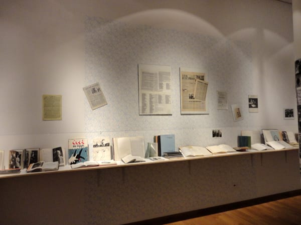 Viewers have a wealth of information to dig through: three walls of shelves as well as coffee-table style cases filled with books, posters on the wall and a beautifully hung screen projection.