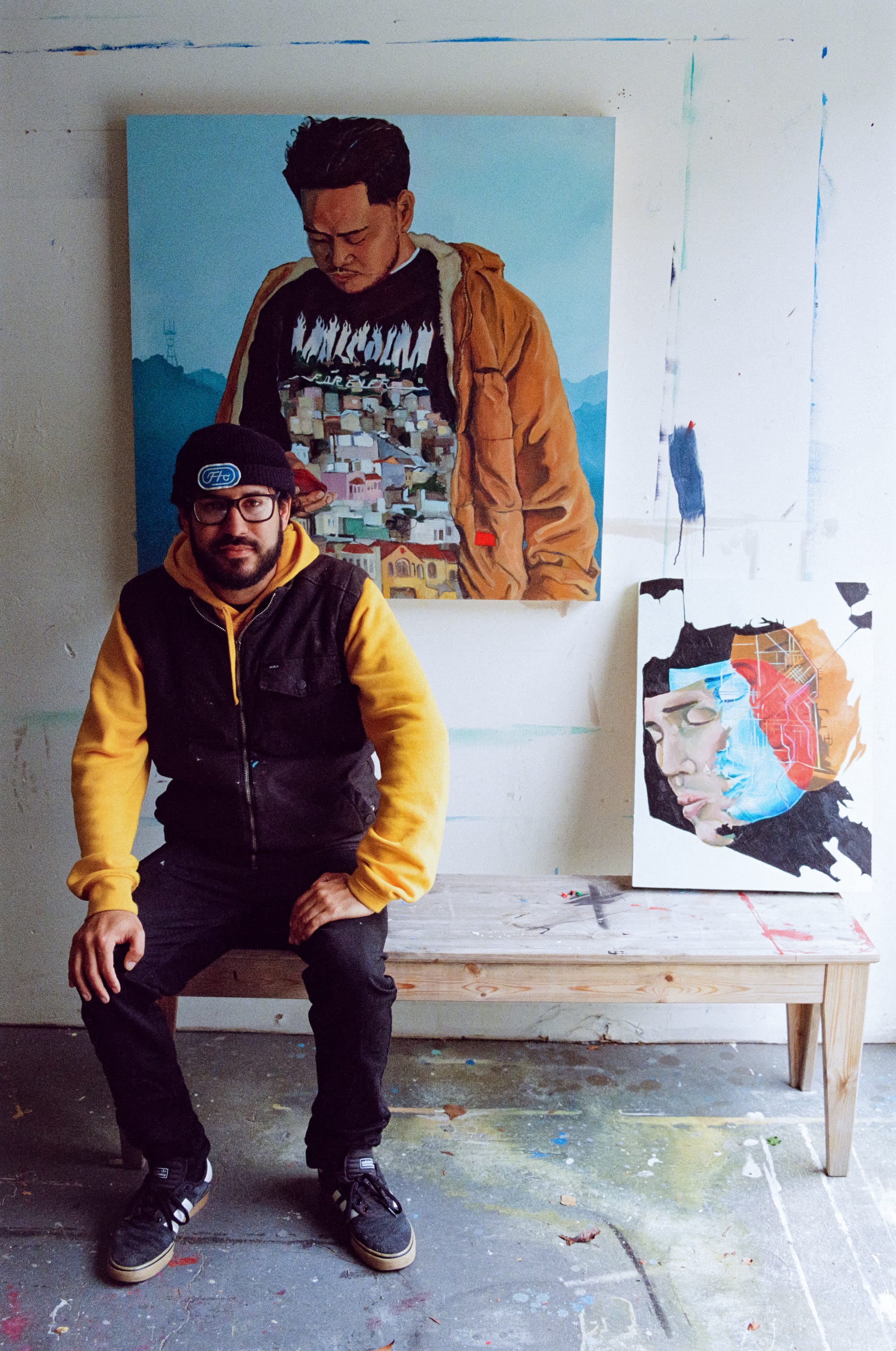Max Marttila’s favorite of his paintings depicts a man in a tan jacket entranced by an iPhone, his body dissolving into a cluster of houses flowing row by row down a hill. The painting captures the San Francisco scenes that Marttila has seen over and over again, framed by train windows in the city where he’s spent his entire life. Much of Marttila’s art is built on maps or geographic references to San Francisco — the routes of the city’s transit system a shadowy underlay beneath a portrait and the edges of the city’s coastline form the outlines of an in-progress painting. Marttila shares a multi-room studio space in a former bike shop, filled with low beams that force visitors to guard their heads, with four other artists. They’ve all known each other for over a decade.
