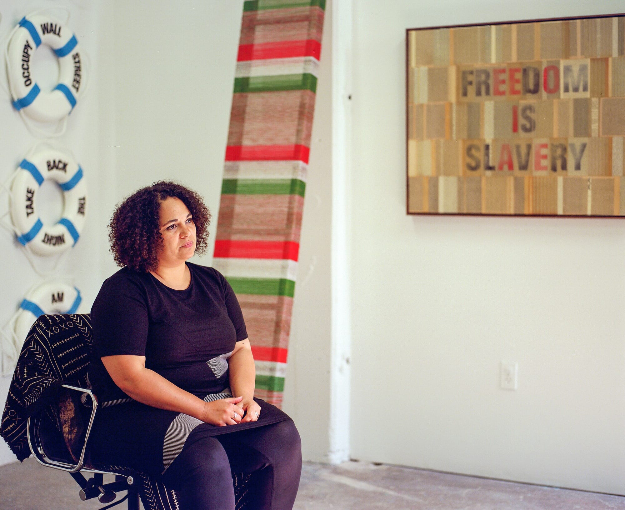 There’s an aged wooden ladder leaning against the wall of the gallery owned by artist and curator Rhiannon Evans MacFadyen. It’s encased in tiny threads of red, white, and green. Artist Brian Singer painstakingly unraveled a Mexican flag and then laboriously wrapped the threads around the ladder, creating a striped pattern with the colors as he worked. Evans MacFadyen’s luminous smile seems to fill the space as she explains the obsessive technique behind his pieces. She’s curated shows for around eight artists each year since she opened her gallery, Black & White Projects, over six years ago.
